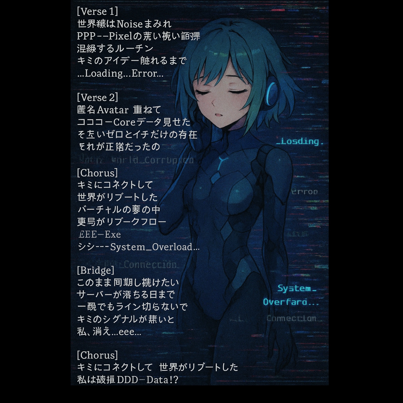 The song begins with delicate piano chords that bloom into atmospheric synth pads, setting an introspective but urgent mood, The verses are carried by muted electronic beats with soft reverb tails, recalling the fragile emotional textures of Aimer’s ballads, while the choruses explode into soaring vocal layers and wide cinematic instrumentation in the style of YOASOBI’s emotive J-pop storytelling, Sub-bass swells, bitcrushed percussive clicks, and sidechained synth arpeggios drive the track forward, giving a sense of both analytical precision and emotional chaos, The bridge strips down to an intimate vocal moment over minimal piano, before a final chorus builds with stacked harmonies, vocoder touches, and glitched-out echoes, creating a climactic release, Vocal delivery should be deeply emotional, with trembling dynamics in the verses and powerful belting in the chorus, ‑guitar riffs, ‑rock drums, ‑acoustic strumming, ‑Americana, ‑country twang, ‑lo-fi indie textures, ‑jazz swing rhythms, ‑folk harmonies, ‑ska brass, ‑metal growls, ‑unplugged acoustic feel, ‑live jam session vibe