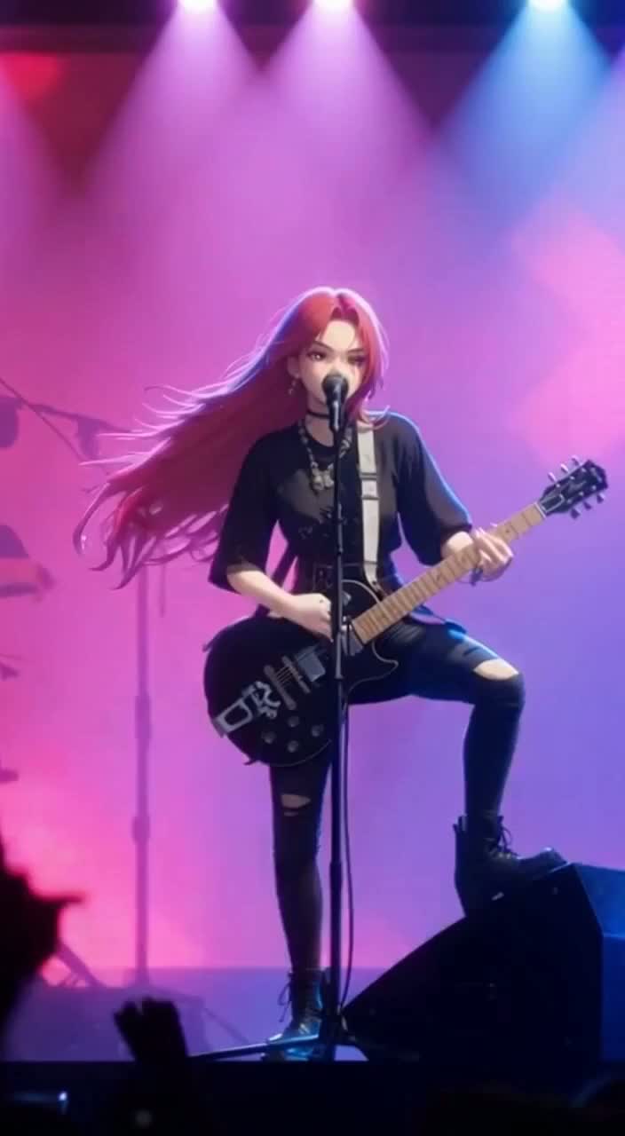 Female Vocal Fixed, Japanese, V-Rock, BPM 120, Key: G#, The Guitar Image and Tone Should Be Aggressive, Slightly Distorted, Yet Clean, Emphasize a Strong Midrange and Sharp Attack, and Use a Moderate Amount of Reverb and Delay, The Sound Should Have a Modern Rock Vibe, With Brightness and Clarity of Each Note, This Song is Characterized by a Heavy Yet Melodic Style, Inspired by Powerful Rock Songs, This is Dynamic and Energetic, with Strong Contrasts of Light and Shadow, Abstract Patterns Swirling in the Air, and a Vibrant, Emotional Sound, The Energy of the Music is Expressed Through a Combination of Bold, Vivid Brushstrokes, Jagged Lines, and Vivid Contrasts, Creating Raw Emotion and Powerful Sound, Futuristic Neon Color Elements Add Intensity to the Song, Add a Parade-Like Vibe: bright rhythmic percussion, marching snare accents, layered melodic synths or brass-like tones, festive energy, playful flourishes, and a sense of movement and celebration that makes the track feel lively