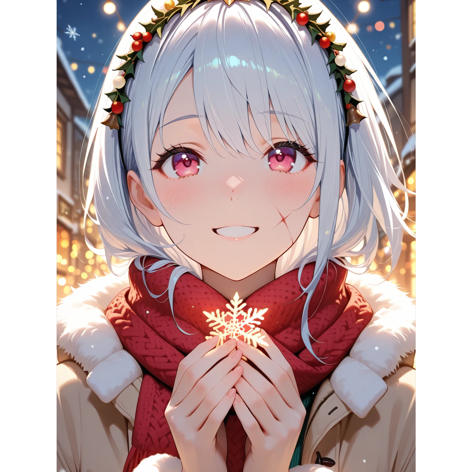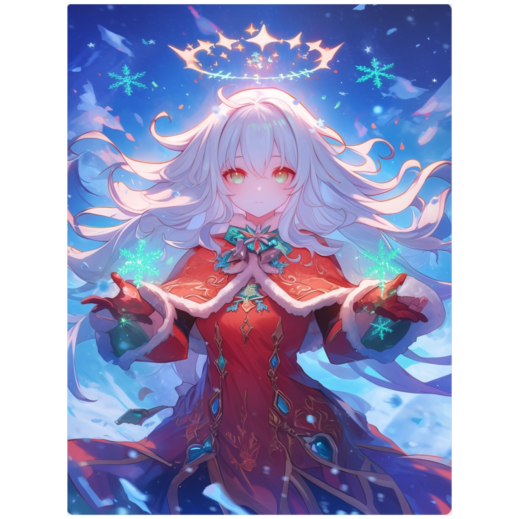 Rusecore × Snow drop × Crystal wave; Female cool vocal; emotional and sparkling winter soundscape that begins cold and silent, then blooms into vivid Christmas colors and warmth, Instruments: crystal harp, handbell, glockenspiel, glass marimba, celesta, theremin, ebow guitar, soft electro synth, vocal pad, Frosty intro → glowing verse → glittering Rusecore chorus → floating interlude → radiant bridge → grand final with all instruments, Shimmering lights, transparent beats, crystal textures, dreamy atmosphere, futuristic yet heartwarming Christmas vibe