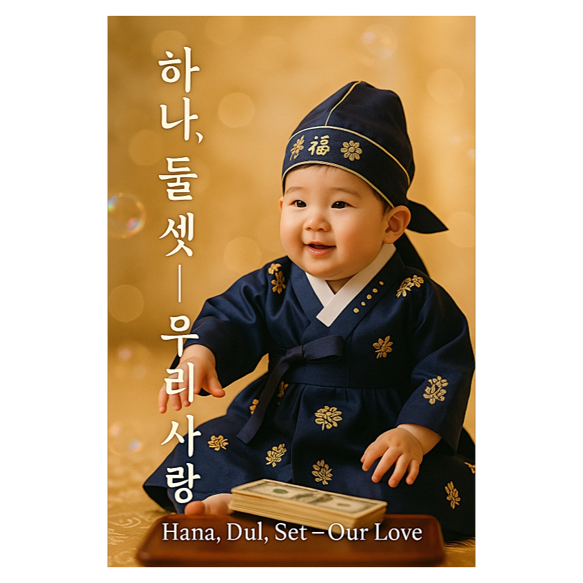 K-pop children’s song / bright ukulele / gentle drums / bells / warm acoustic bass / female & male duet (parents) + child chorus / joyful & tender “돌잔치” vibe