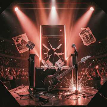 Late-80s hardcore concert energy fused with hard rock: uptempo 170 BPM double-time drums, thunderous tom fills, snare crack, and repetitive driving bass, Screaming electric guitars with pinch-harmonic solo riffs, feral electric violin lines, and all-out male vocals front and center, thick with arena-size distortion and raw live-room bleed