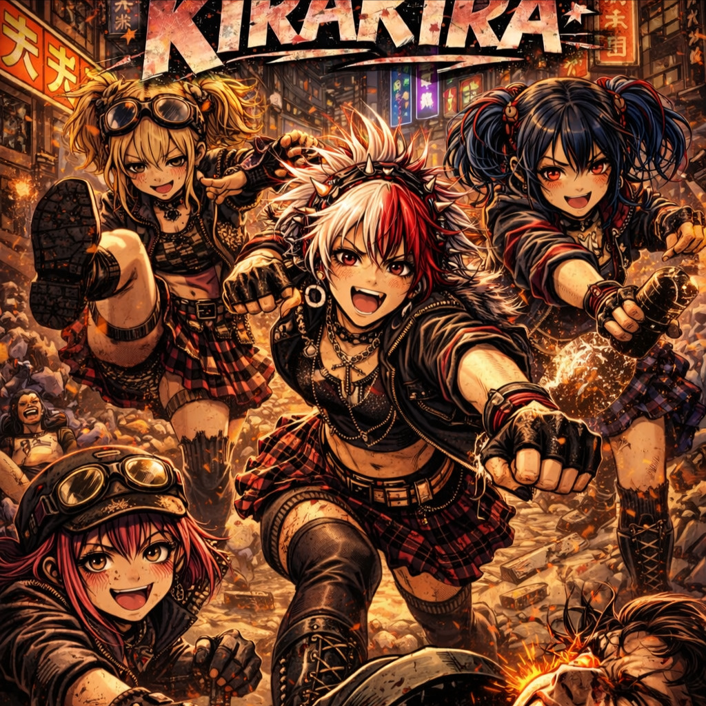 [Vocal Style: Dual female vocals — feral screams, sharp melodic cleans, taunting delivery, gang shouts, Japanese with punchy English, ]
