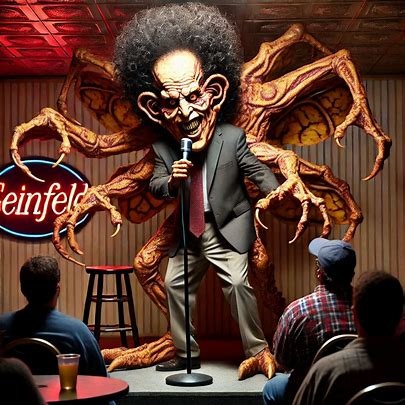 live comedy act, seinfeld, harsh noise, upset stomach, crowd cheering, live audience, laugh track