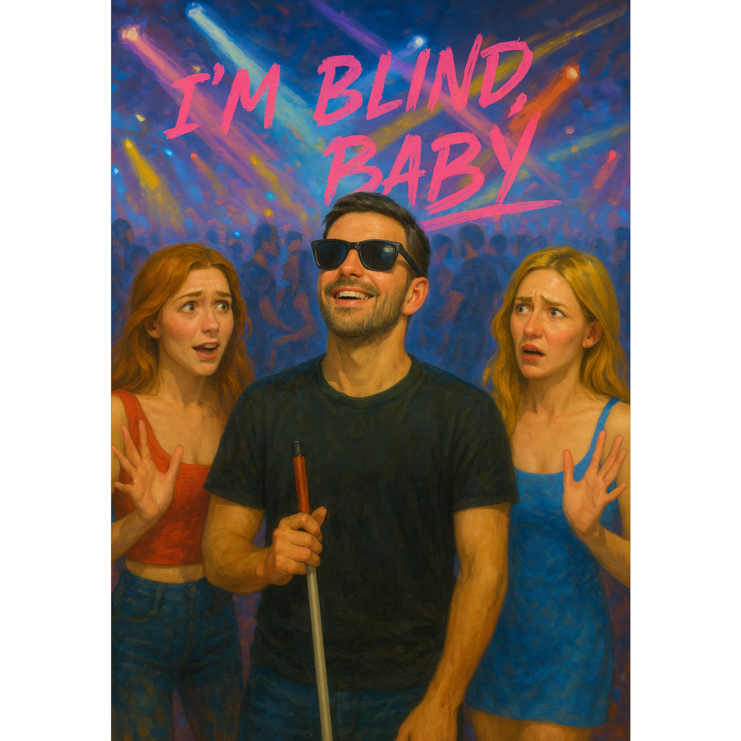 Tempo 138 BPM, 4/4, key of F minor, A bass-driven, bounce-heavy EDM banger with slamming low-end, rubbery slap bass, and thick UK bass subs shaking the floor, Hyper-bouncy future-bounce chords punch the groove while festival trap snares snap on the twos, Distorted bass shots growl through the verses, switching into booming complextro fills and metallic stabs before the drop, Build tension with psytrance risers, pitch ramps, and laser FX, The drop should explode with jumpstyle kicks, wobbling bass swings, and sidechained synth shots that hit like a riot, Vocals are loud, playful, cocky, and rhythm-forward, leaning into the comedy of being blind, ignoring A I thirst-trap girls, and living only for the beat, Make it huge, bouncing, body-shaking, and absolutely unignorable