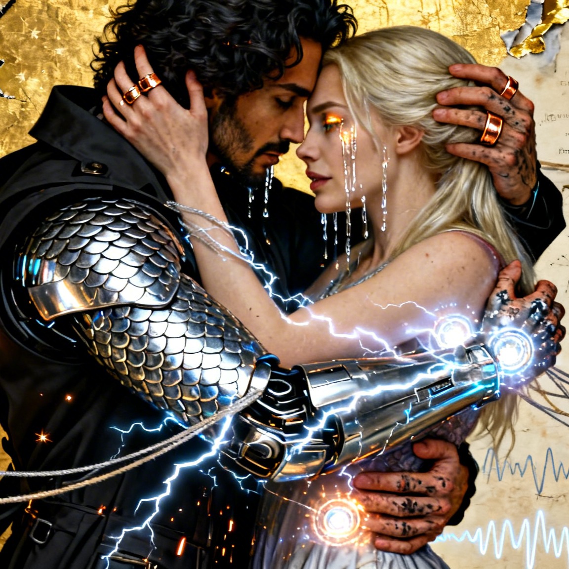 Duet: Male Riven XE and Female BellaBelle, basslines that drag, Drum machines, breathy vocals, 58Hz, goth, EDM, Raw voltage, reverb, passionate, emotional, synthwave, ‑80’s 90’s