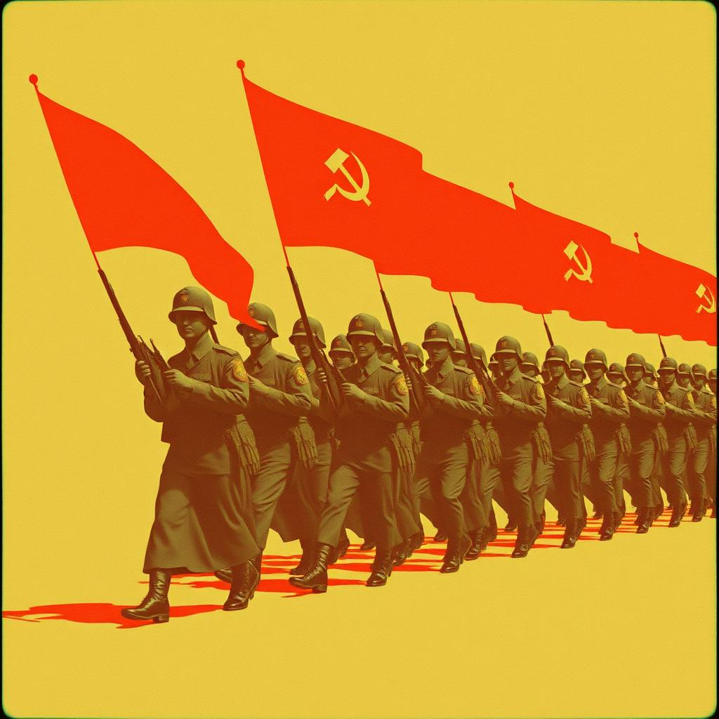 A powerful and dramatic Russian folk-inspired military march, featuring a male choir, brass, and percussion, The song is in a major key, with a strong, driving tempo, The instrumentation includes a prominent brass section with trumpets and trombones, providing a heroic and martial feel, Percussion, including snare drums and cymbals, emphasizes the march rhythm, The male choir sings in unison, creating a powerful and anthemic sound, The song structure is verse-chorus, with the chorus being particularly impactful due to the full instrumentation and vocal power, The melody is memorable and uplifting, conveying a sense of national pride and determination, The production is grand and expansive, with a clear and resonant mix that highlights the brass and vocal harmonies, The overall feel is one of unwavering resolve and strength