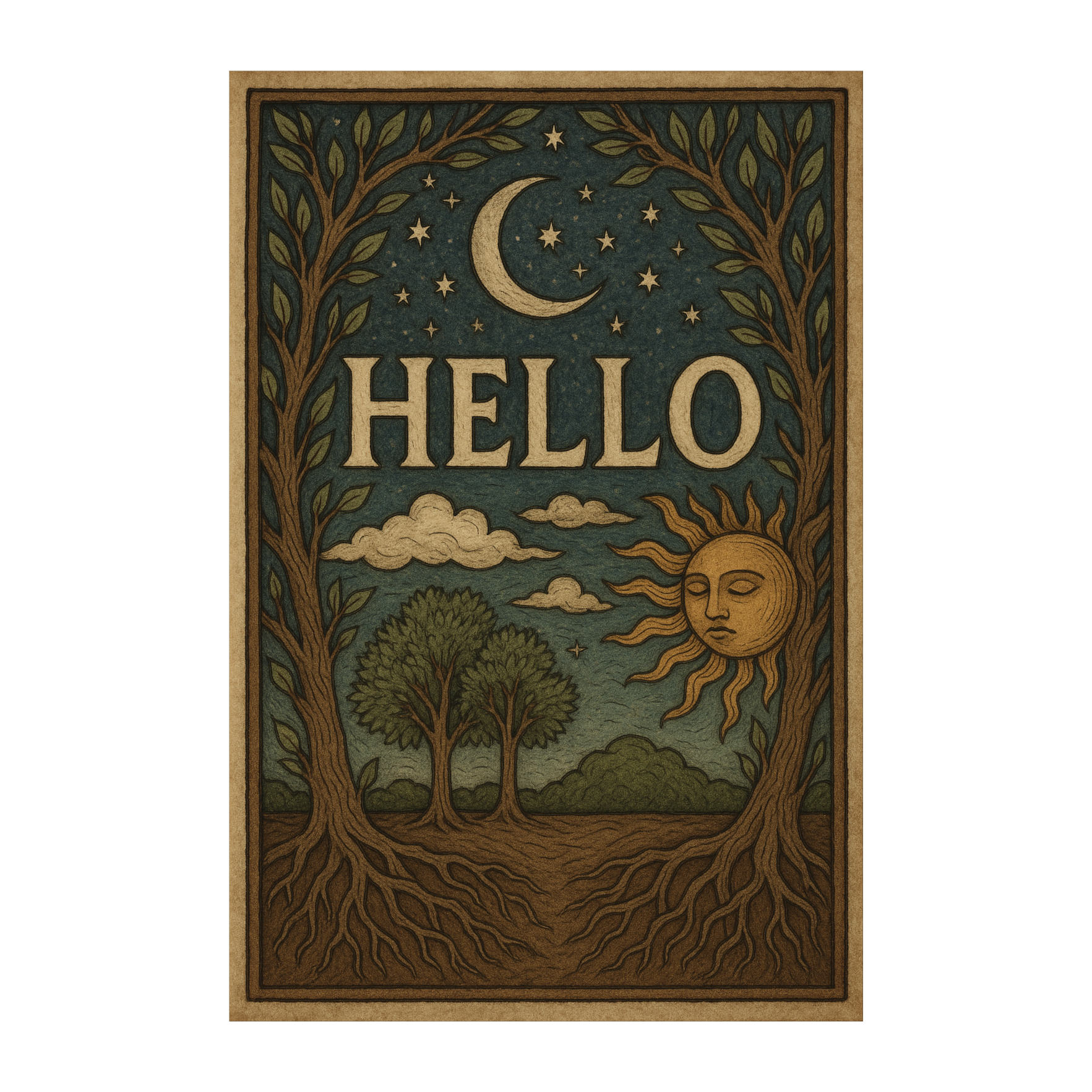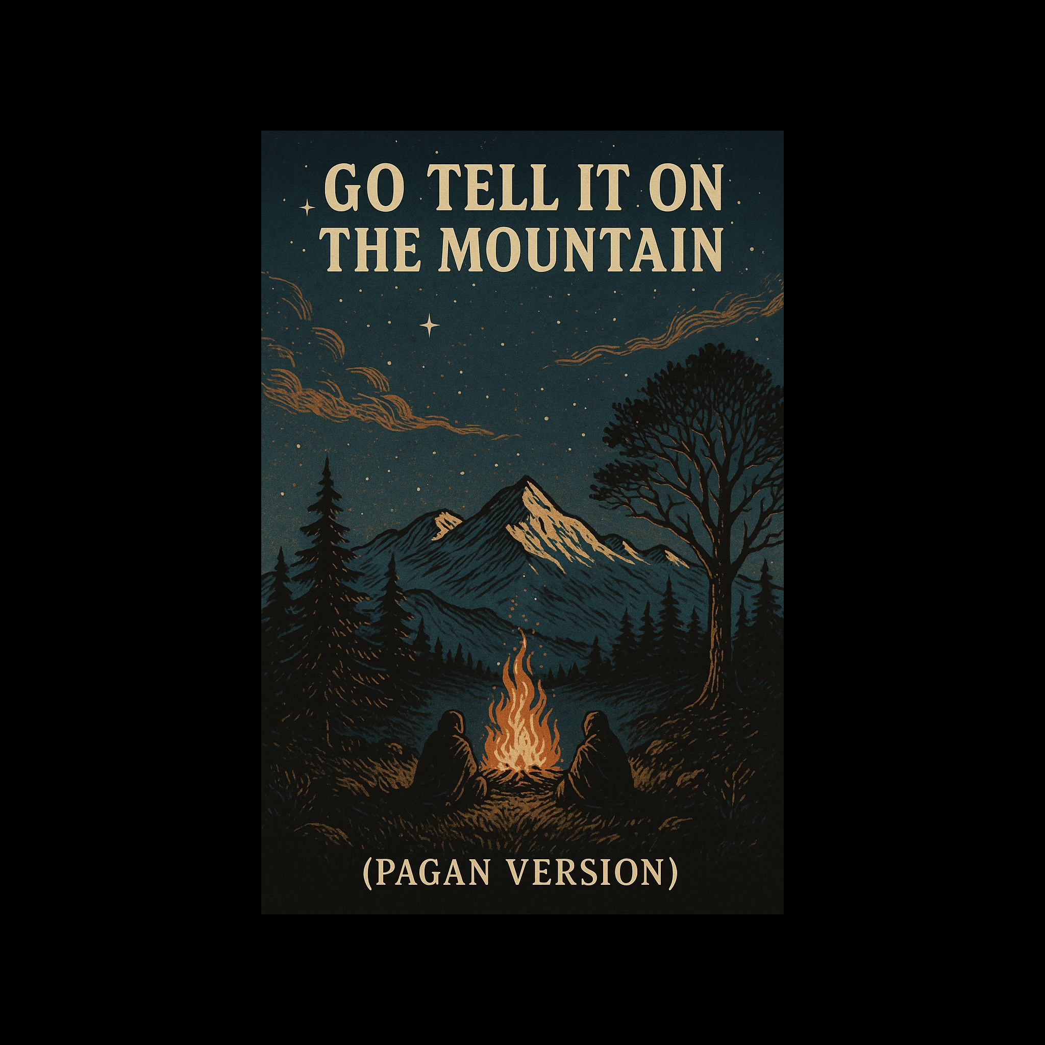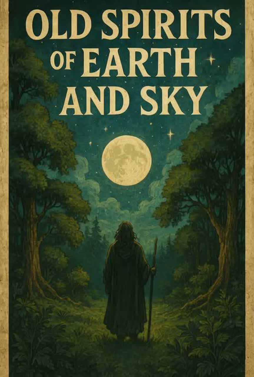 A mystical pagan folk ballad with a ritual tone, Gentle acoustic guitar, frame drum, and ethereal flute carry the melody, Vocals should feel like a chant or invocation, soft yet powerful, as if addressing the stars, moon, sun, clouds, trees, and earth in turn, The mood flows from cosmic wonder to earthly grounding, ending in acceptance of death as part of the natural cycle, Harmonies should feel ancient and reverent, echoing like voices around a sacred fire, Atmosphere: spiritual, nature-bound, timeless, with Celtic and Norse folk influences