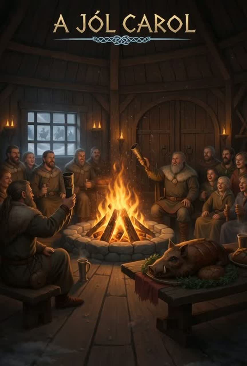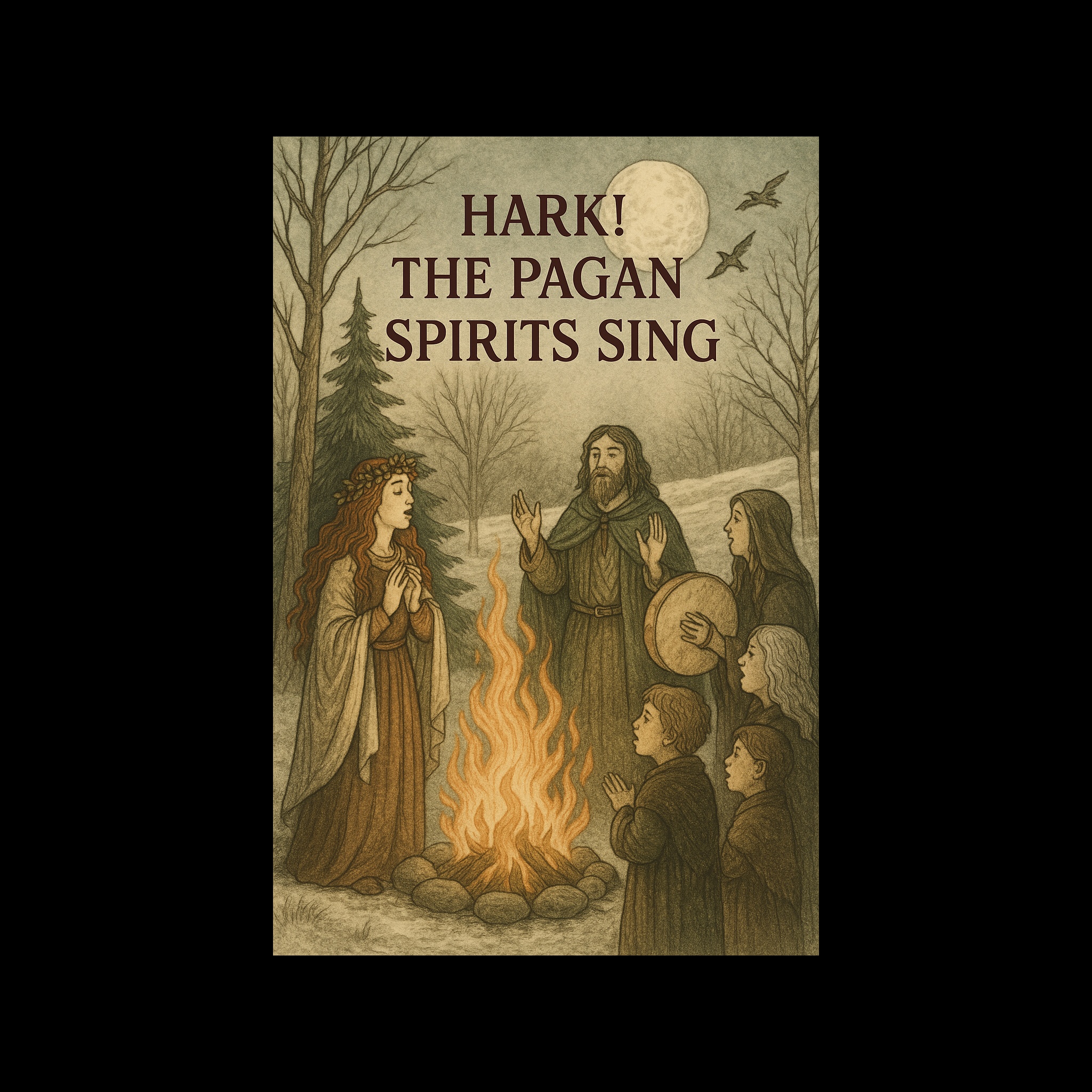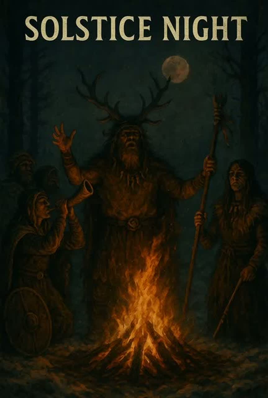 Slow building ritual Nordic folk chant rooted in ancient winter solstice energy, Deep frame drums and distant war drums pulse like a heartbeat beneath the earth, Layered throat singing drones blend with raw male vocals chanting in unison and in call and response, Sparse bowed lyre, bone flute, and low tagelharpa-style strings drift in and out like cold wind through pine trees, Tempo is steady and ceremonial, designed for trance and procession rather than dance, Atmosphere is dark, ancestral, frost bitten, and reverent, Gritty natural reverb, crackling fire ambience, and subtle animal hide percussion, The tonal mood should feel like standing in a snowy forest at midnight during a solstice rite, solemn, powerful, and eternal