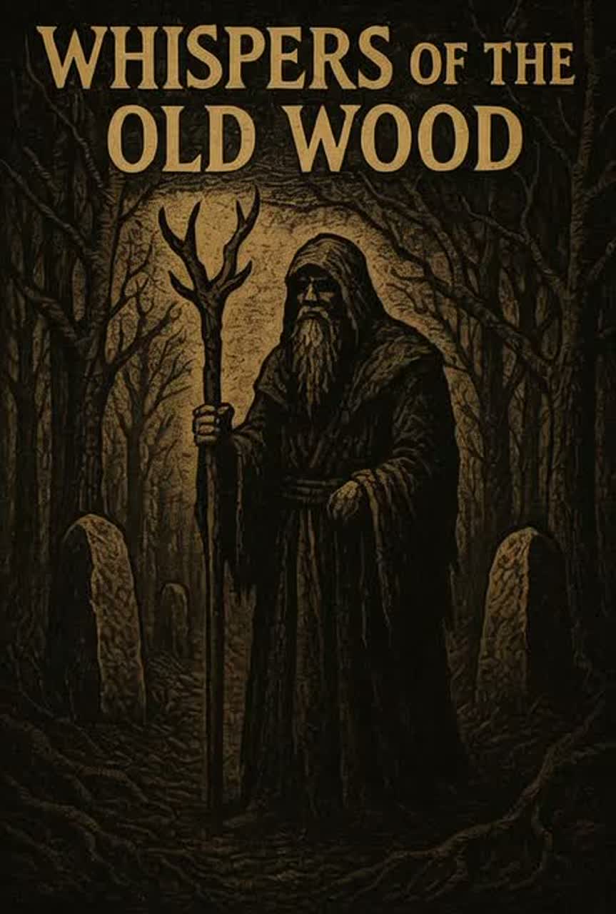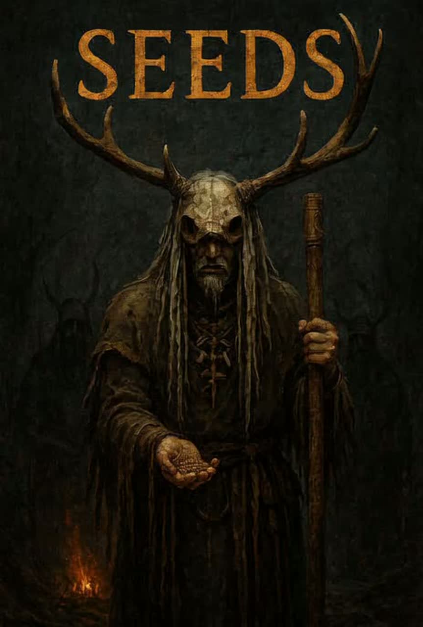 Ritual folk song with deep tribal drums, bone shakers, and low chanting male vocals, Slow tempo with heavy percussion and droning string instruments, Add distant horn notes and metallic hits for atmosphere, Sound should feel ancient, earthy, and powerful, like a storm ritual in the woods at night
