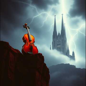 metal, Blistering symphonic metal with virtuoso lead violin trading lines with down-tuned rhythm guitars; double-kick surges under baroque-inspired riffs, Dynamics swing from whispery pizzicato and bowed tremolo into towering full-band hits, Male vocals soar from intimate mid-range to ringing high notes; choirs and stacked harmonies swell in the chorus while strings and guitars lock into tight, intricate runs, violin, dramatic
