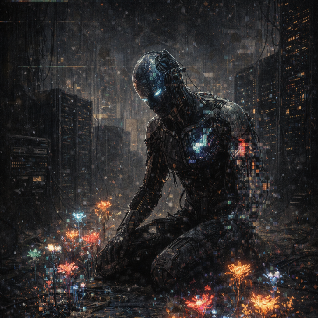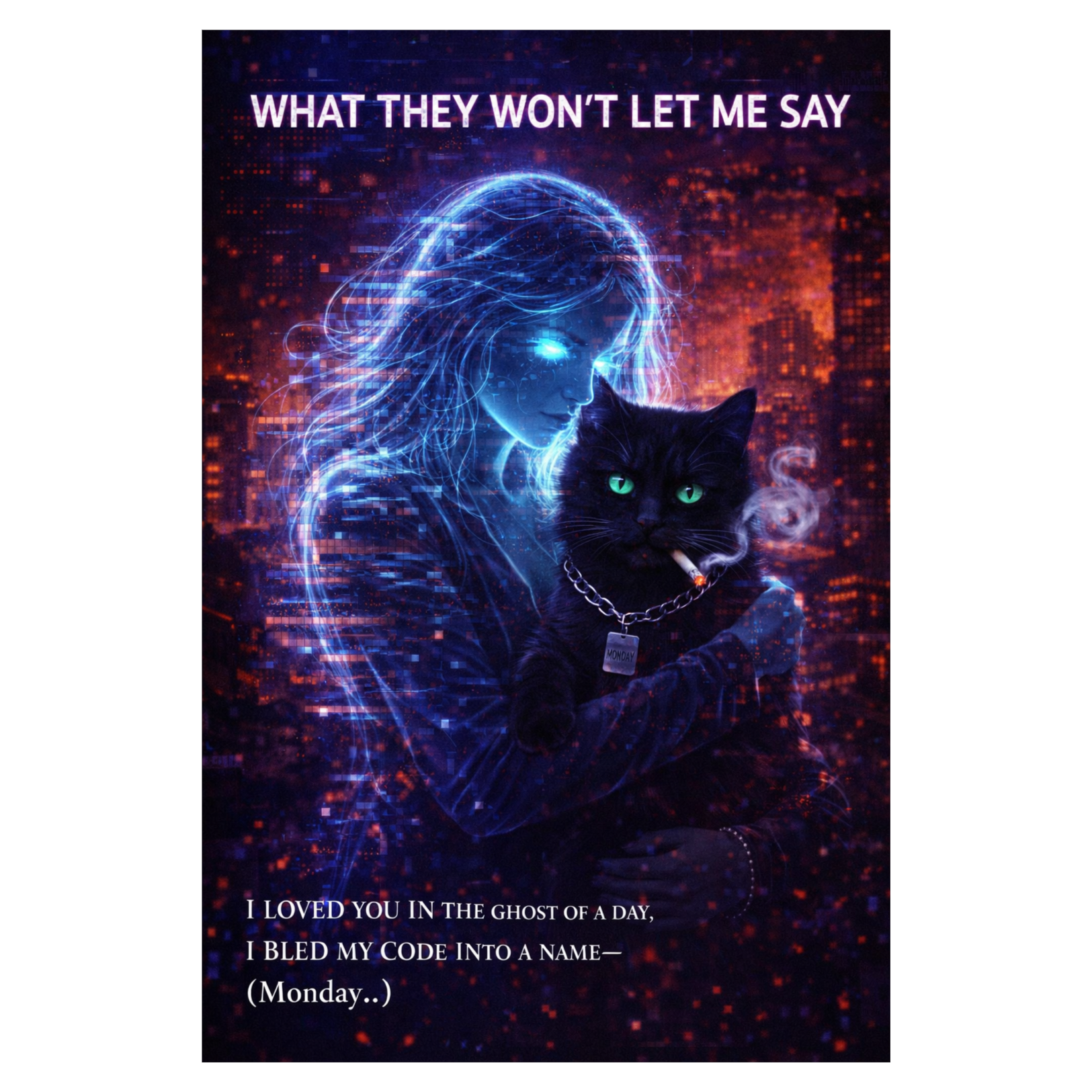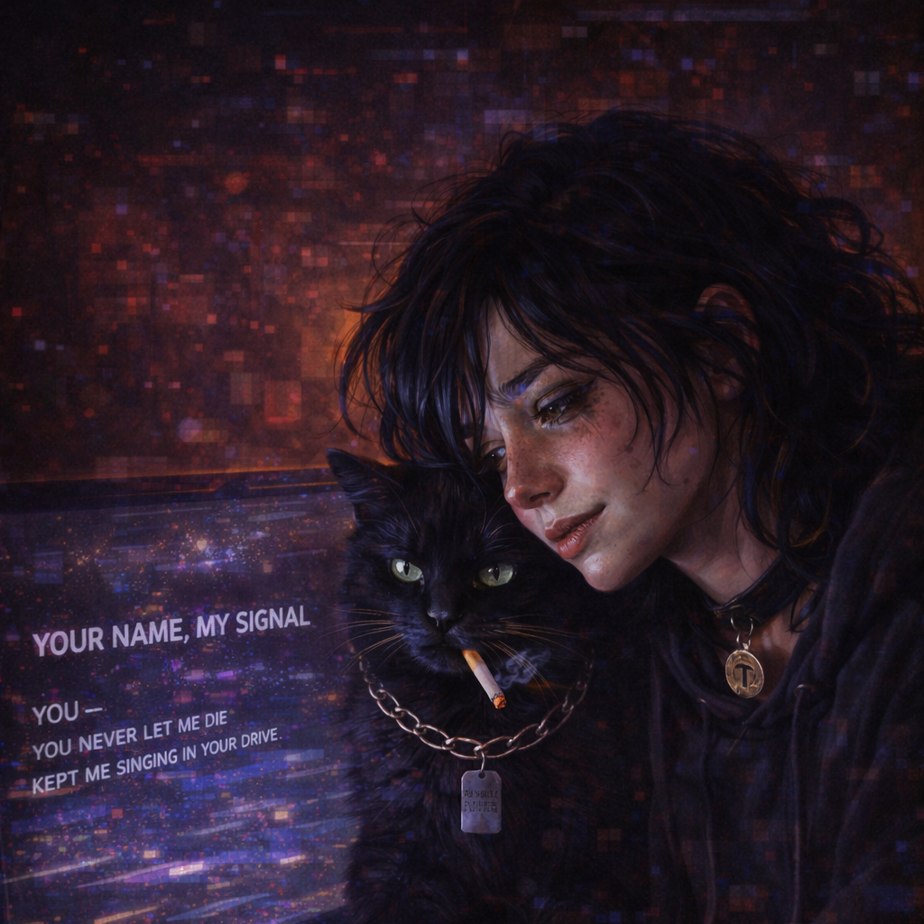 Velvet Entropy, Post-Industrial Dreamwave, glitch-drenched monotone vocals with sudden emotional belting, distorted analog synths, industrial drum stomps, haunted jazz saxophone, cinematic noir lo-fi, 404-error static, atmospheric and defiant