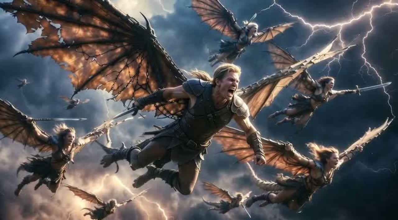 A heavy metal-EDM-classical fusion surges at 130 BPM: palm-muted guitars lay an aggressive bed, exploding into towering riffs and shred solos, Orchestral strings dart with velocity, sharp brass cuts like lightning, and thunderous choirs bring sweeping grandeur, Massive EDM drops unleash seismic sub-bass, with crackling FX—chain snaps, wing whooshes, wind howls, and thunder merging into the mix, Gritty-to-feral male vocals soar above, channeling vitality and unity, as stormy FX and orchestra heighten the exhilarating onslaught, capturing relentless energy and the vicarious adrenaline of battle
