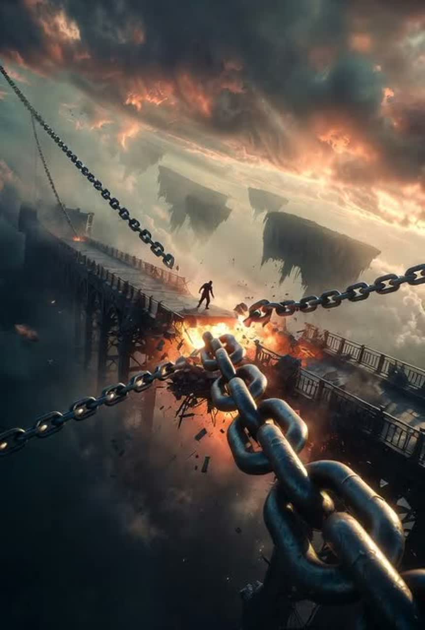 A heavy cinematic fusion at 120–130 BPM begins with frantic palm-muted guitars and pulsing sub-bass, plunging into relentless shred solos over surging EDM drops, Racing orchestral strings and stabbing brass snap alongside whipping chains, thunder, and wind FX, Distant fractured choirs wail above, while gritty-to-feral male vocals rip through panic, rage, and ecstatic defiance, all propelled by screaming metal punches and a maelstrom of collapsing orchestral chaos