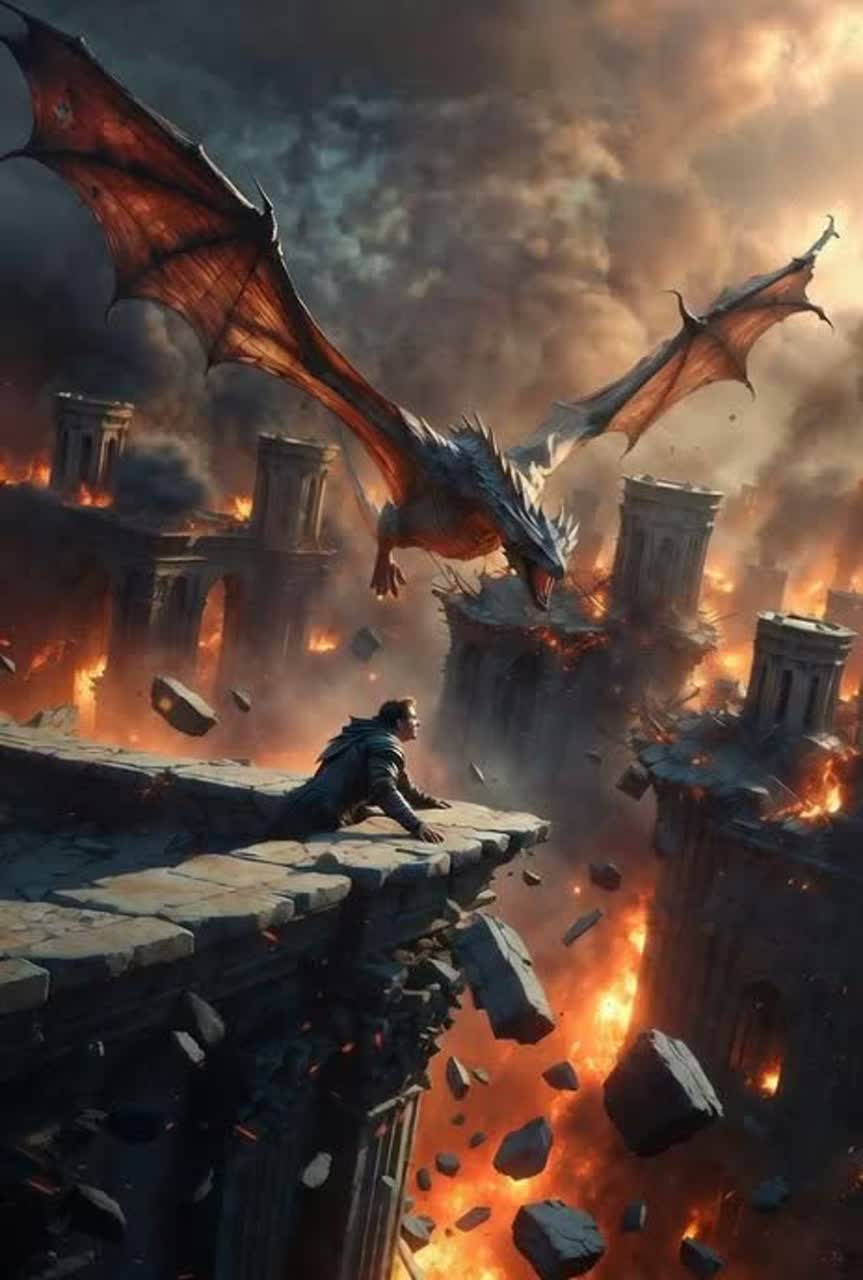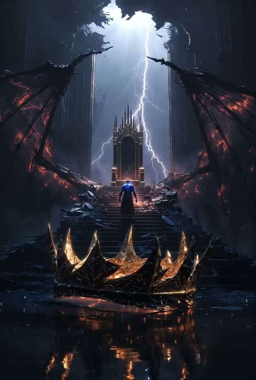Opens with thunderous cinematic metal guitars—palm-muted chugs grow steadily before erupting into soaring leads, Deep EDM sub-bass drops surge beneath, evoking collapsing empires, Regal minor-key orchestral strings unfurl, low brass mourns with solemn dirges, and distant choirs amplify grandeur and loss, Gritty-to-haunting male vocals ride the 90–100 BPM pulse, echoed by lightning cracks, rumbling stone, crown-metal rings, and fading roars woven into the mix, forging a tragic, majestic, and immense fusion