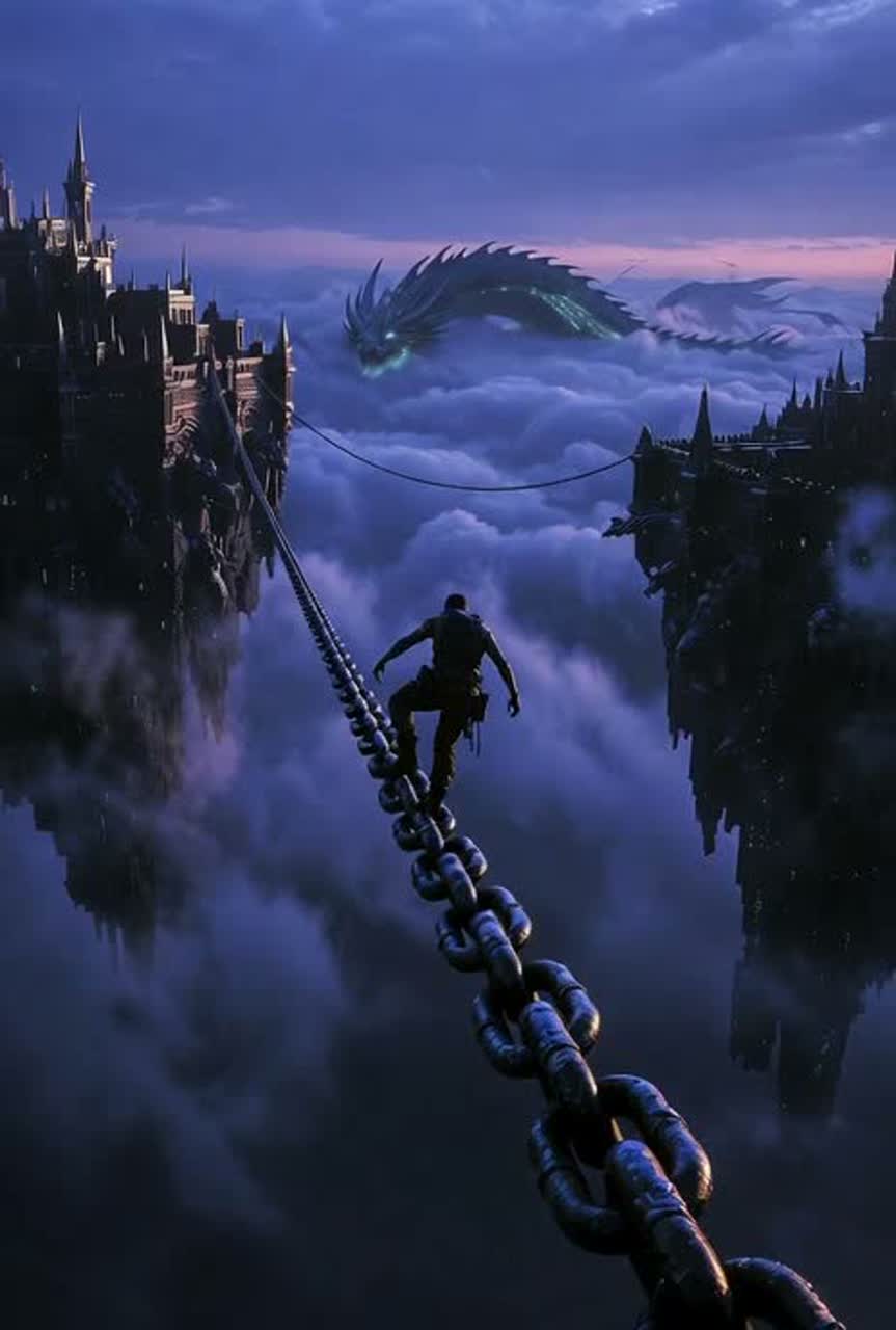 This heavy metal-EDM-classical fusion opens with thunder cracks and wind FX, erupting into grinding guitars, blistering leads, glitchy percussion, and surging sub-bass drops, Racing orchestral strings and brass stabs clash with distant choirs, Gritty, strained male vocals preside, as chain groans and stone rumbles infuse the soundscape, maintaining a relentless 105-115 BPM pulse that stirs primal dread and awe, Imagine the wonder and awe and trepidation of climbing the chains to a feral dragon lair, hard drop