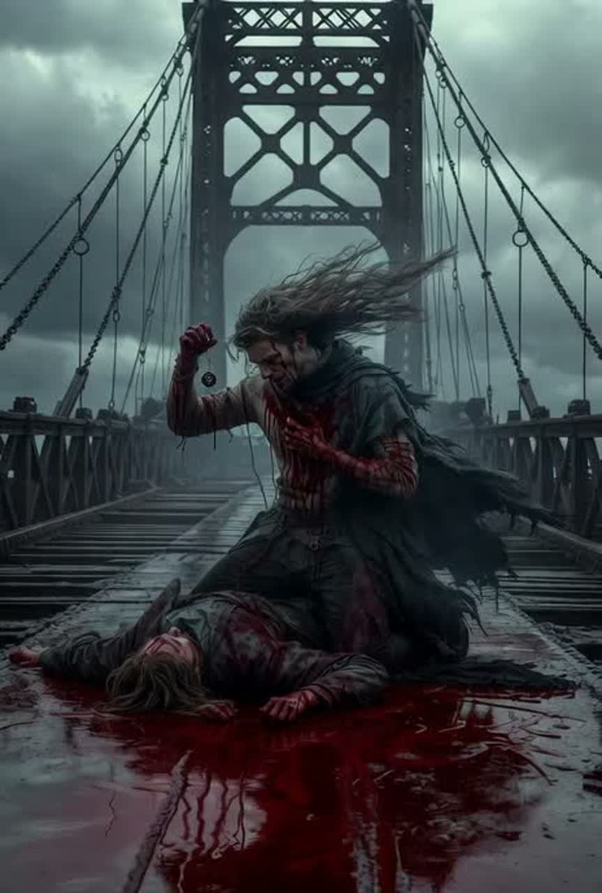 A heavy cinematic metal-EDM-classical fusion driven by sinister palm-muted guitars that erupt into jagged, thunderous riffs and explosive solos, Deep, pulsing sub-bass EDM drops hit like a gut-punch, Racing, tense orchestral strings and cold, brassy stabs intensify the drama, as fractured distant choirs swell in isolation, Gritty-to-ferocious male vocals arc from raw disbelief to icy vengeance, Blade-scrape, chain-snap, and thunder-crack FX and howling wind swirl at 105-115 BPM, conjuring a soundscape both apocalyptic and fiercely resilient