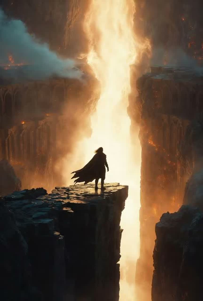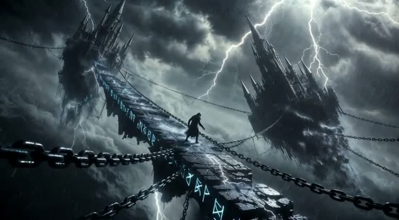 Heavy cinematic metal-EDM-classical fusion, aggressive palm-muted guitars and shredding leads dominate with deep sub-bass EDM drops and glitch percussion, layered with epic orchestral strings, brass swells, and distant choirs, male gritty vocals with occasional harmonized growls, building tension and drama, tempo 95-105 BPM, thunder cracks, chain clanks, wind howls integrated as sound design, sense of vertigo, ancient menace, and escalating awe, echo female, lush harmonies