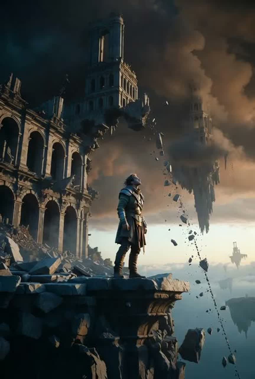 Sparse palm-muted guitars start the heavy metal-EDM-classical fusion, each note piercing a vast reverb, Glacial sub-bass pulses fade between epic orchestral strings, mournful cello, and windswept choirs, Stone rumbles and debris FX accent haunting silences; gritty male vocals float, restrained and ethereal