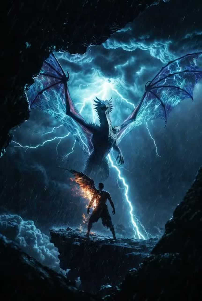 Heavy metal-EDM-classical fusion, explosive aggressive guitars with palm-muted tension builds and blistering soaring leads, massive sub-bass EDM drops that land like thunderclaps, racing epic orchestral strings and sharp brass lightning stabs, powerful distant choirs mimicking wingbeats and storm roar, male gritty-to-triumphant lead vocals conveying terrifying ecstasy and bodily awakening, tempo 115-125 BPM, ozone crackle FX, wing-unfurling whooshes, thunder rumbles and electric vein-pulse integrated, evoking dizzying rush of power, addictive terror-joy, and inevitable transformation