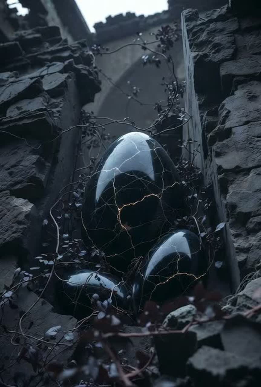 Heavy cinematic metal-EDM-classical fusion with restrained aggression, slow-building palm-muted guitars and shimmering lead lines, subtle deep sub-bass EDM pulses and glitch flickers like dying light, ethereal orchestral strings and harmonics, mournful low brass, distant celestial choirs, male gritty hushed-to-intense lead vocals conveying intimate wonder and aching melancholy, tempo 88-98 BPM, soft wind sighs, faint egg-hum rumbles, vine-creak and stone-crack FX, evoking profound loss, defiant hope, and cosmic intimacy in forgotten ruins