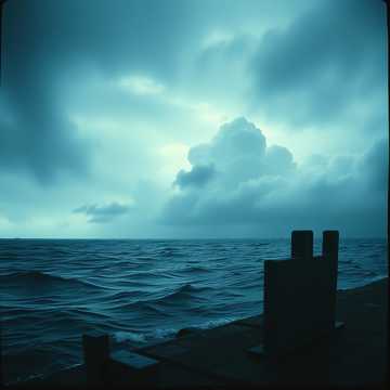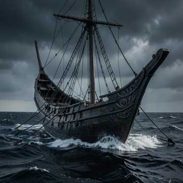 A lone, weathered baritone commands with unadorned a Spoken-Word Invocation, his vocals emotional and deep, raspy, shifting from measured phrases to forceful crescendos, Authoritative pauses punctuate the vocal narrative, while atmospheric sounds of waves splashing against a wooden boat and wood creaking fill the backdrop