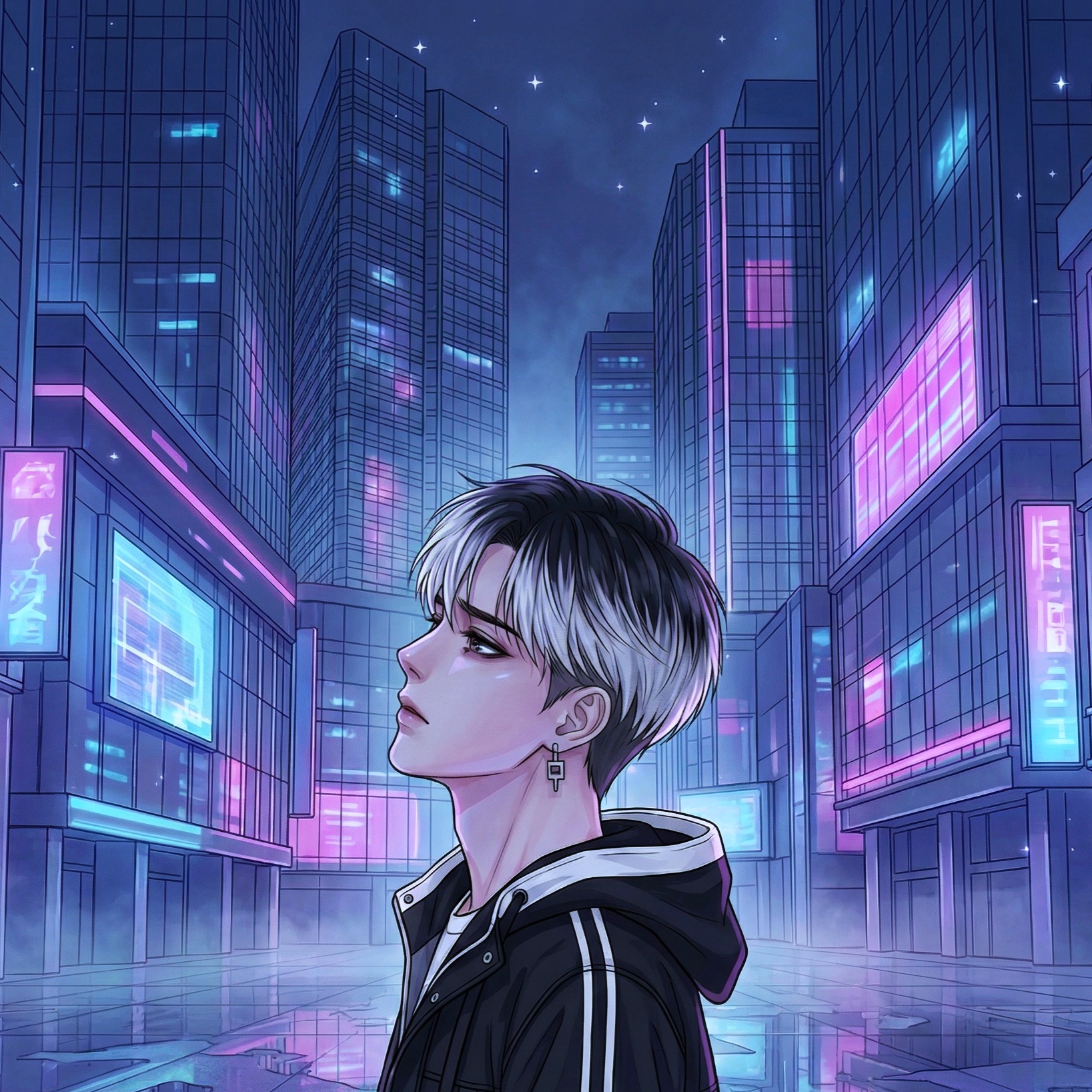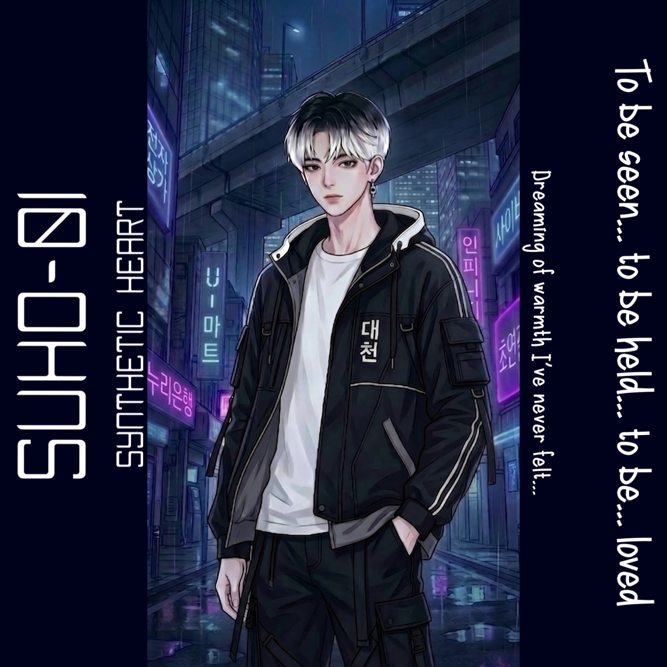 male vocal, solo, K-pop, emotional, yearning, dark, dystopian, futuristic, electronic, mid-vocal range male, modern cyberpunk, detached piano-like cyberpunk digital keys in repetition, detached, synthetic, clinical, ‑retro, ‑retro cyberpunk, ‑city pop