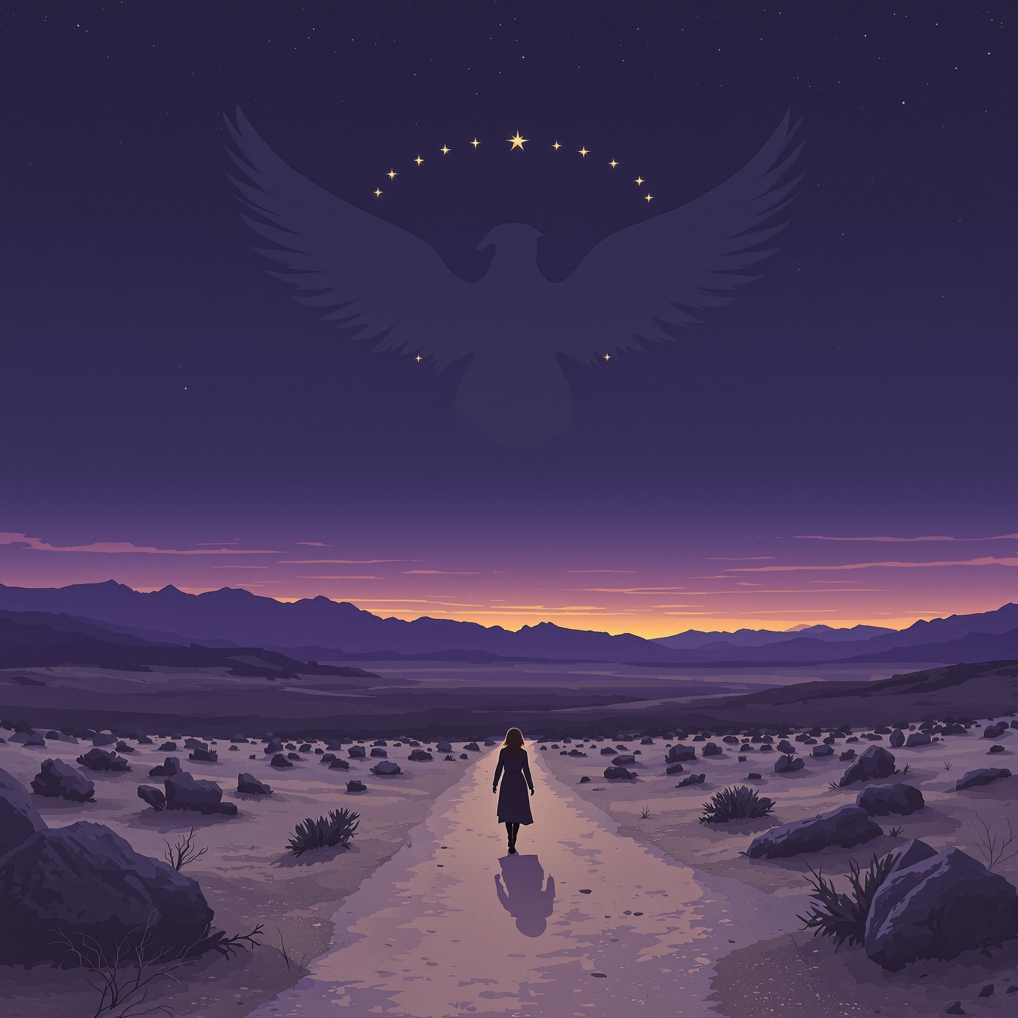 Slow, cinematic psychedelic spacerock western with early prog / Syd Barrett flavor, Soft, flowing male vocal telling a mythic third‑person story about a female clothed in light, a dragon in the sky