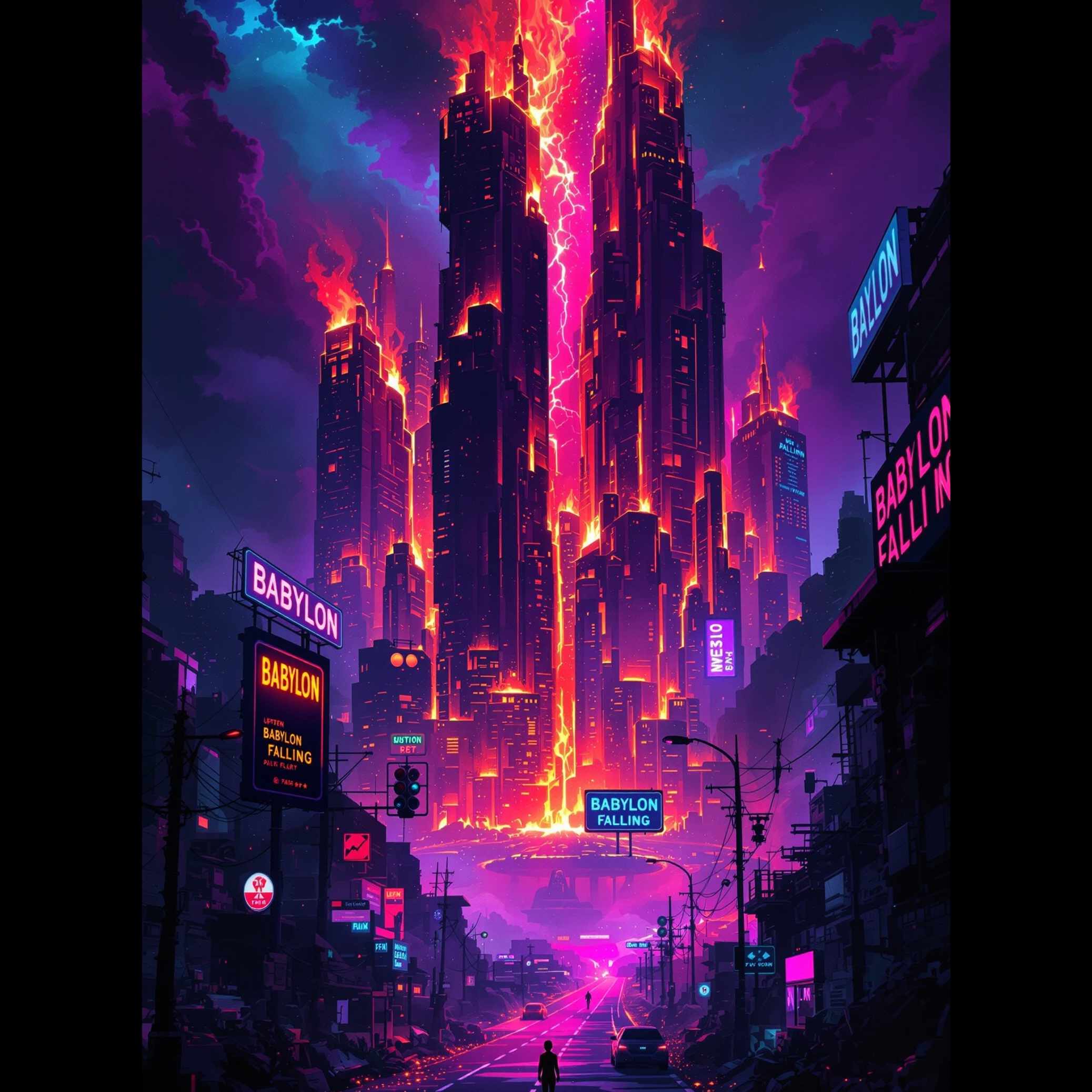 Dark, heavy late‑60s/early‑70s psychedelic space‑rock in a Syd‑Barrett / early Floyd spirit, but more menacing, Slow to mid‑tempo groove with a deep, slightly overdriven bass, roomy but hard‑hitting drums, and snarling, echo‑soaked guitars that weave around the vocal, Vintage analog‑style synth pads and creepy melodic fragments swirl like city lights and sirens, creating a grim, collapsing‑city atmosphere, Ethereal but stronger male vocal in first person, the traveler walking through a decadent Babylon‑city and then watching it burn in one hour, while kings and merchants wail from a distance, The music should feel heavier and more chaotic than “No Broken Kings, ” with sections where the groove surges and almost falls apart, like a psychedelic building coming down, but still melodic and not metal