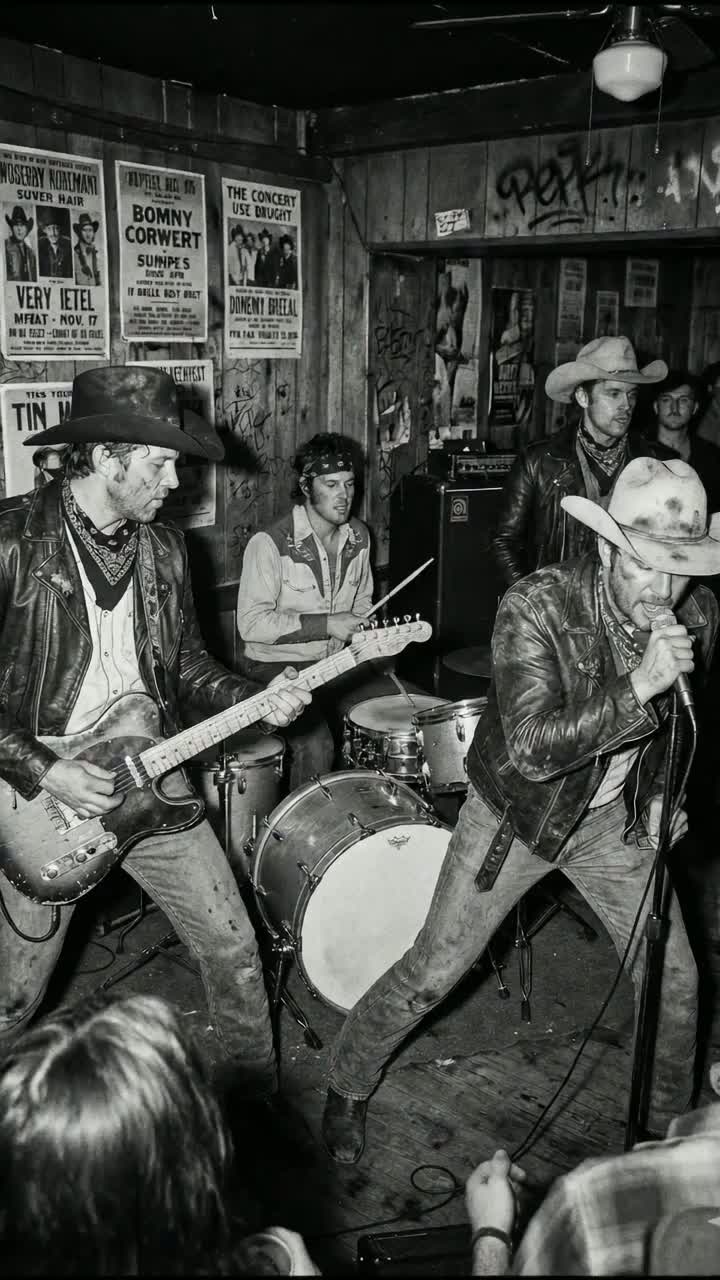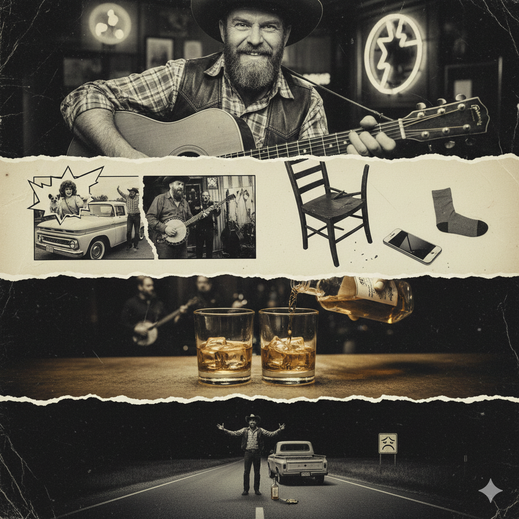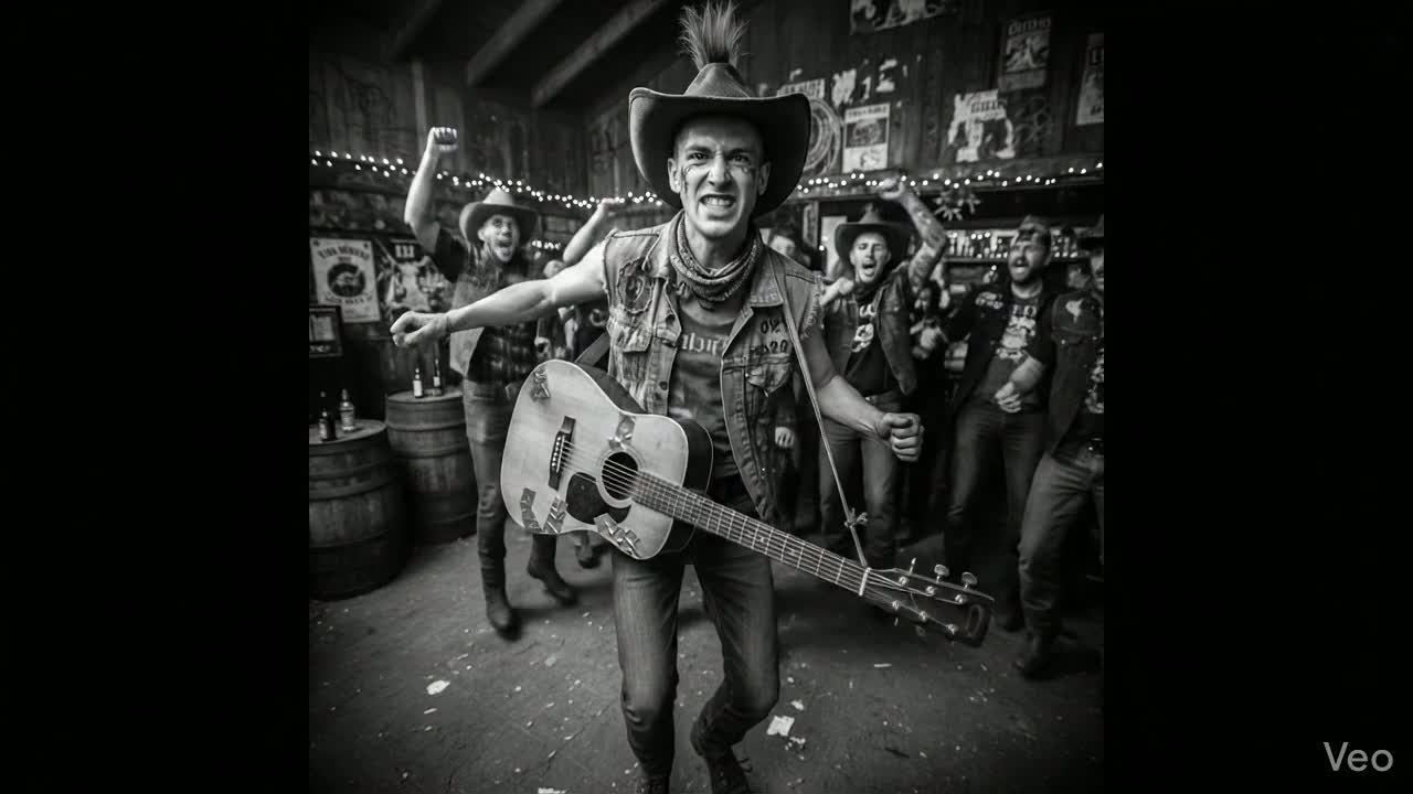 This cowpunk live track storms out with fast-paced electric chords, agile acoustic runs, a relentless 150 BPM pogo-beat, and crowd-fueled momentum, Verses drive with Hammond organ swells, resonant harmonica, bass-baritone vocals, and gritty, locked-in rhythms, Choruses ignite with steel slide accents, interlocked countrybilly guitars, and layered folk-rock density, all riding dynamic drum surges and raucous audience energy