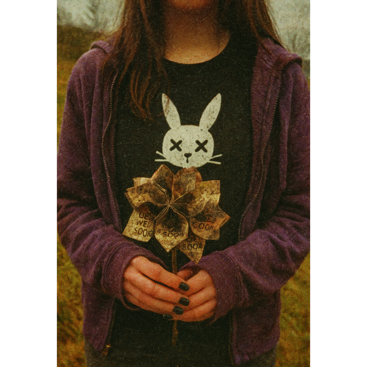 Lo-fi witchy punk and dreamy shoegaze energy with a raw garage edge, Fuzzy electric guitars shimmer in reverb haze over a steady mid-tempo groove around 100 BPM, Japanese Female vocal, soft and clear but loud when called for, half-whisper half-snarl, close-miked and doubled for grit, The verses feel smoky and confessional, like someone singing from a dimly lit living room at 3 a, m, ; the choruses bloom into bright distortion and overdriven sweetness, Analog warmth, live-room drums, melodic bassline, feedback ghosts and tape flutter, The mood shifts between intimacy and mania — haunted, sultry, unbreakable, End with a swirling fade of layered “can’t tear me away” echoes, dissolving into feedback and reverb tail