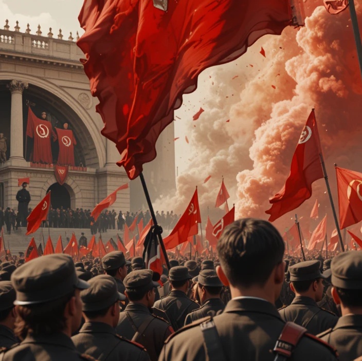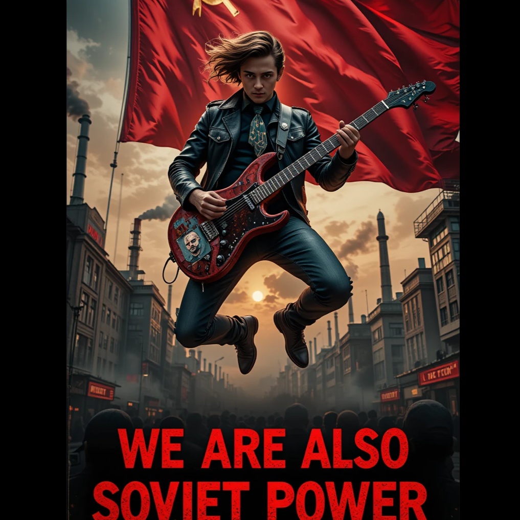 Create a Soviet rock anthem with powerful drums, distorted guitars, and choir-like vocals, Patriotic lyrics about Soviet youth, Dramatic minor to major chord progressions, Militant march rhythm, 80s