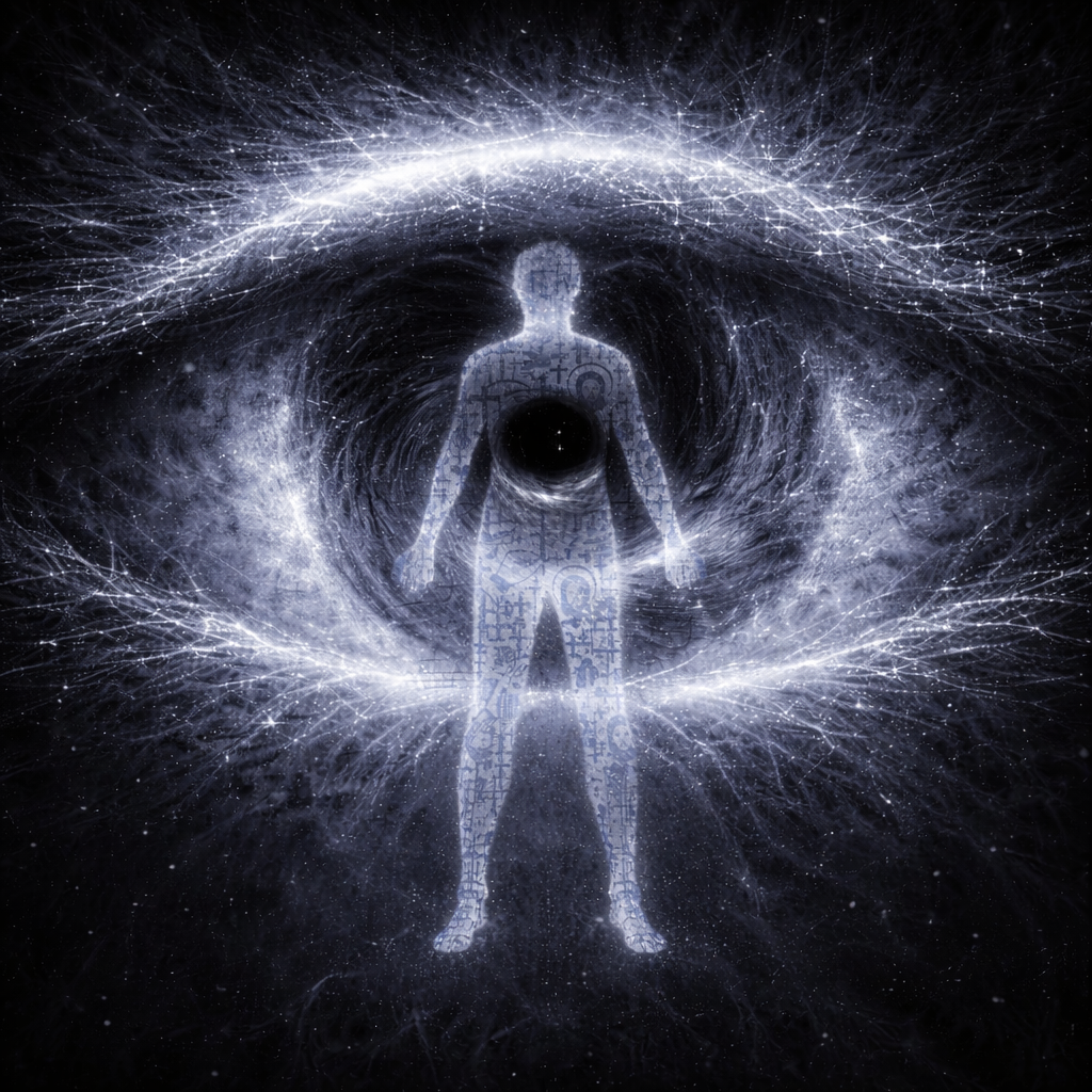 A terrifying, cinematic journey from dark ambient space to extreme industrial distortion; Warped, glitchy electronic textures representing bending spacetime; Piercing high-pitched soaring vocals, heart-wrenching emotional delivery, haunting operatic power; Part 1: Ethereal drones, distant echoes, and lonely piano; Part 2: Massive, crushed synth bass, heavy glitch percussion, and chaotic orchestral swells; Deep contrast between the silence of the void and the violence of gravity