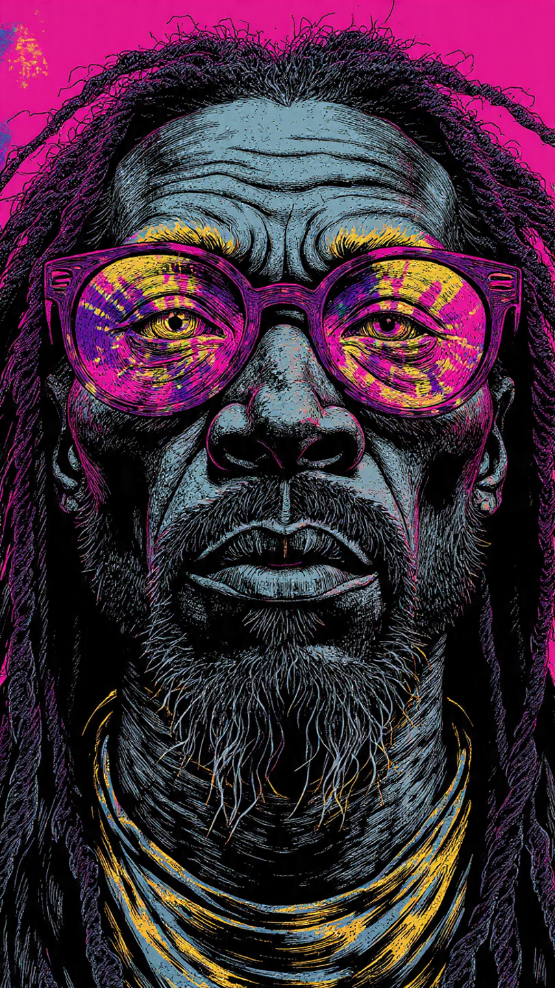 Global fusion psychedelic explosion โข mix of late 60s psychedelic blues rock, African tribal percussion, deep Reggae grooves and skanking guitar offbeats, and modern electronic bass โข hyper, glitchy, freaky, playful, and slightly unhinged โข high-energy male vocals with humor, character, and chaotic swagger โข fast tempo shifts, call-and-response chanting, world-instrument layers over fuzz guitars, analog distortion, and bass-heavy drops โข wild crowd shouts, reversed FX, nonsense syllables, language mashups, and over-the-top ad-libs โข vibe: mad genius, cosmic street rave, global unity through sound, unfiltered creativity exploding across continents
