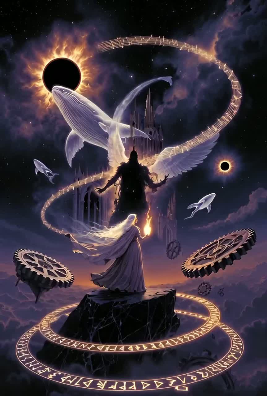 symphonic prog + medieval folk + orchestral-EDM hybrid, wizard-fantasy overture, pipe organ, harpsichord, Mellotron strings, choir pads, Moog leads, virtuosic keys, dramatic modulations, recurring leitmotifs, multi-section suite, odd-meter turns, tight unison riffs keys+guitars, acoustic + 12-string shimmer into crunchy power-chords, soaring harmonized leads, neoclassical solo runs, flute/recorder motifs, Hammond rotary grit, warm fingerstyle bass growl, anthemic singalong chorus, tom-driven drums with gated punch, crashing cymbals, sweeping orchestra strings + brass fanfares, fantasy choir swells, timpani/taiko hits, folk colors: hurdy-gurdy, nyckelharpa, bagpipes, bouzouki, hammered dulcimer, tavern chants, ritual stomps, club-impact accents: sidechained sub + low 808 support, risers, snare-roll builds, subtle dark electro-pop pulse, cathedral organ drone, cosmic reverb, wide stereo, modern hi-fi clarity, tight low end, loud but dynamic master