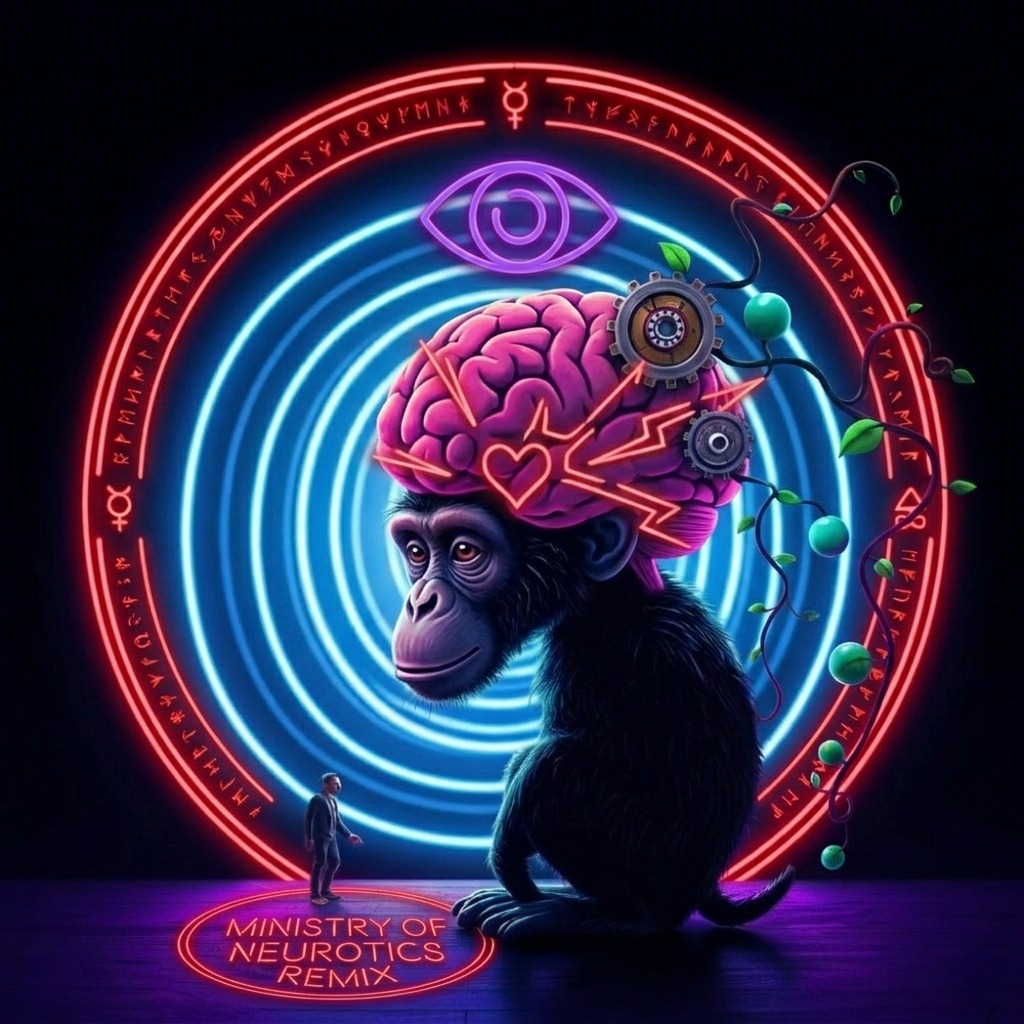 This now thrice stolen composition evokes a small, pensive monkey contemplating its place in an big, illusory and psychedelic universe, neuroacoustic engineering, and experimental sound design by a man and or monkey, possibly 🐿️!, 1male 1female duo harmonising vocals, melodic, punchy bass, robotic vocoder bass, pagan, dynamic drumming, syncopated beats, vocal bass didgeridoo, harmonic minor, celestial, ambience, ethereal vocals, soothing rhythm, generated angelic vocals singing verses and choruses, minor keys, warm synth pads, layered vocals, haunting synths, emotional melody