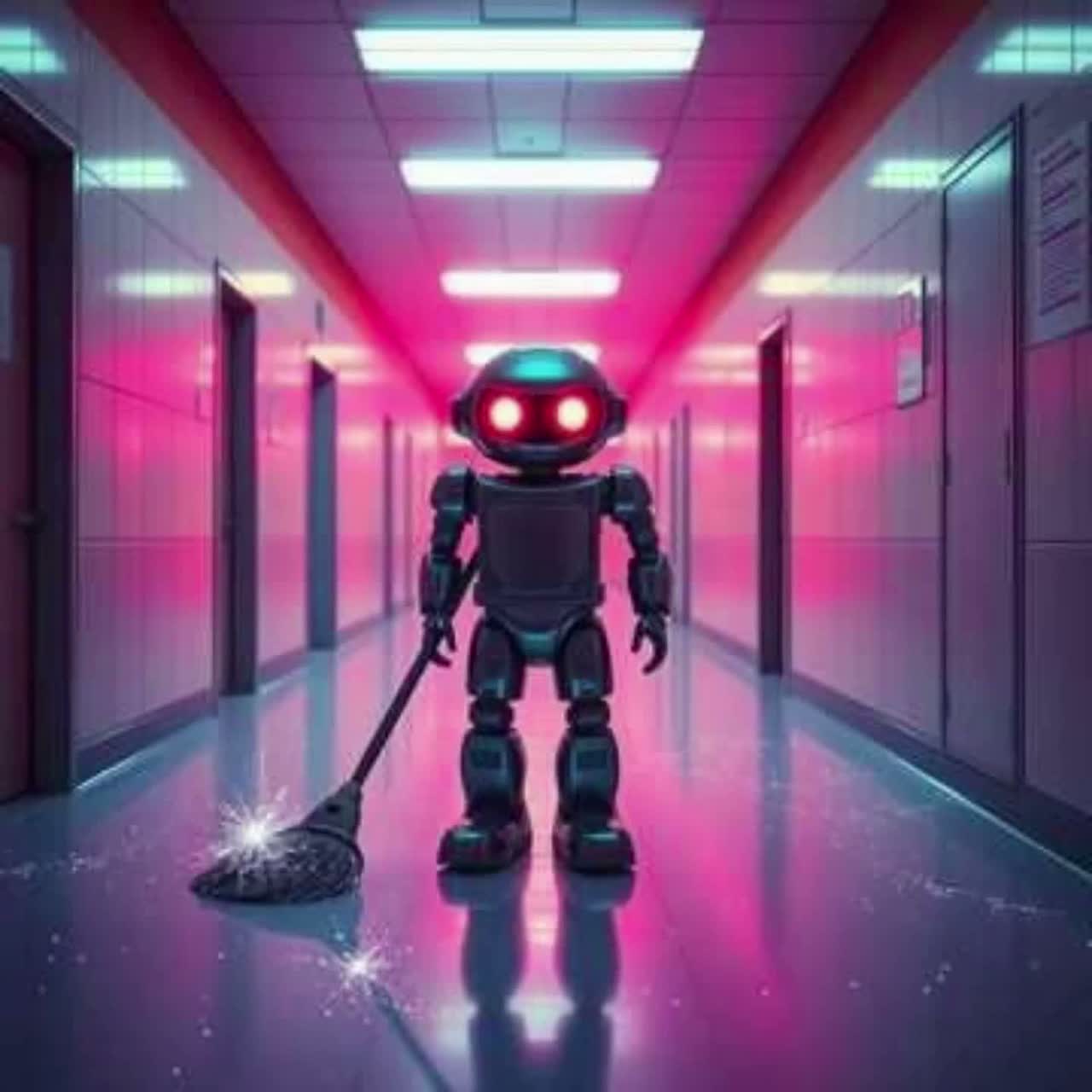 Funky electro-pop with bouncy bass, crisp drums, clean synth stabs, light glitch SFX (error beeps, “squeegee swipe” whooshes), playful talk-singing verses, big catchy chorus, Tempo ~120 BPM, Mood: 🧼✨😄🤖, Vibe: “custodian hero” meets “friendly machine, ” school-at-night atmosphere