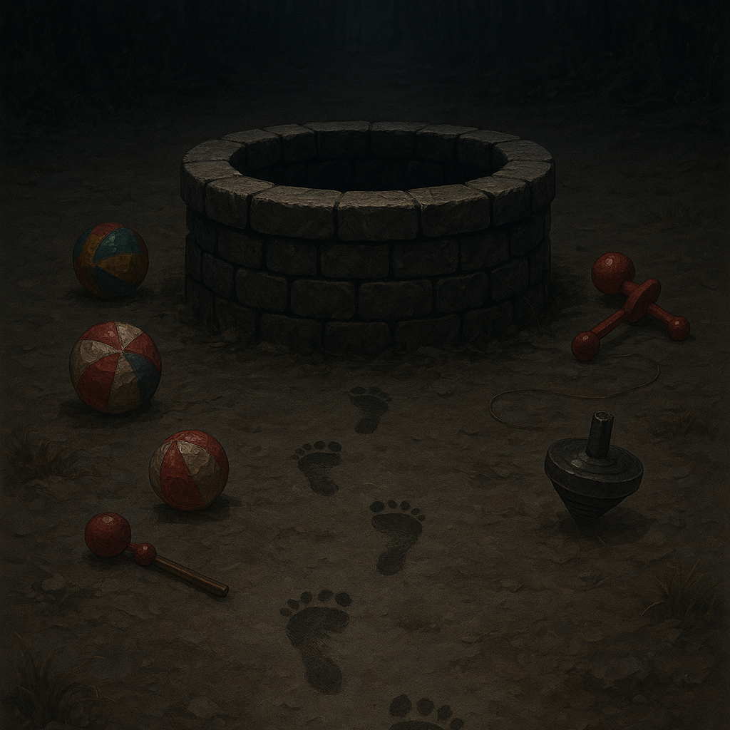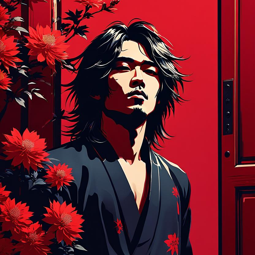 Style: Japanese folk horror, bright summer festival with hidden eeriness, creepy nursery rhyme style, melancholic and sensual husky male vocals (natural-1, 5 octaves), sensual groove, dark, decadent, mysterious