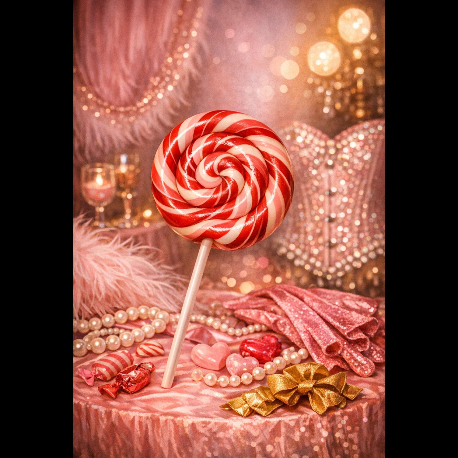 Theatrical, playful cabaret track with sensual, cheeky female vocals, Mid‑tempo (85–95 BPM), bouncy and rhythmic, with exaggerated, burlesque‑style phrasing, Bright, candy‑colored instrumentation — clarinet, pizzicato strings, toy‑piano accents, upright bass, tap‑style percussion, Vocals delivered with comedic timing, expressive articulation, and flirtatious energy, The mood is sweet, mischievous, slightly naughty but humorous, like a cabaret performer teasing the audience with a lollipop metaphor