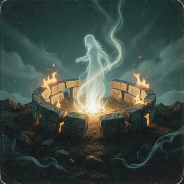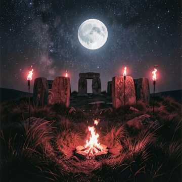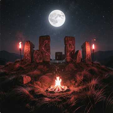 Dark progressive trance, Celtic and Nordic ritual atmosphere, deep frame drums, mystical male vocals, ethereal female vocals, female spoken word, haunting flutes, low choirs, 126 bpm, night ceremony, stone circle, ancient magic
