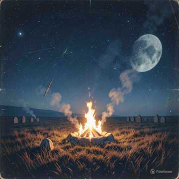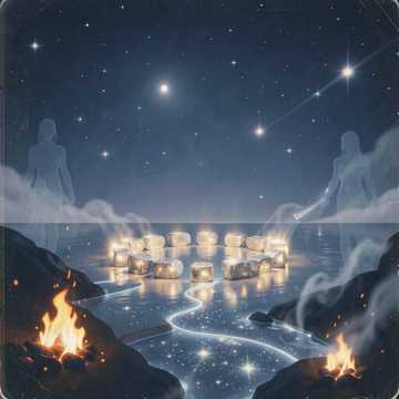 Dark progressive trance, wide night sky atmosphere, deep shamanic drums, emotional male vocals, ethereal layered female vocals, female spoken word, subtle flutes, distant chants, 124 bpm, spirit council, ancestors, star-filled sky