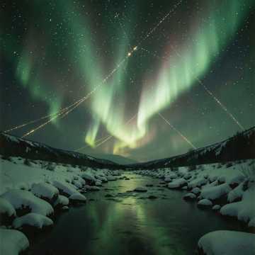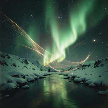 Dark progressive trance, Nordic night atmosphere, aurora borealis, deep emotional male vocals, ethereal shimmering female vocals, female spoken word, slow rolling bass, gentle but driving beat, 124 bpm, spiritual vision, sky magic, cosmic connection