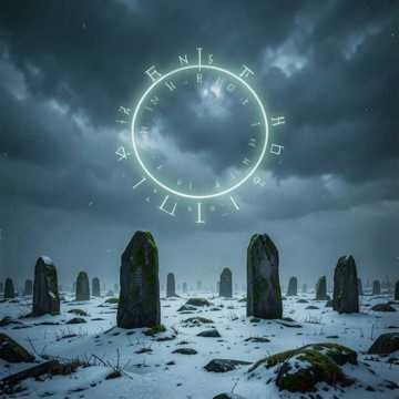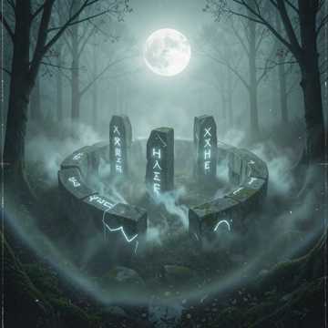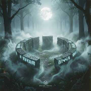 Dark progressive trance, mystical Celtic and Nordic atmosphere, deep rolling bass, ancient frame drums, haunting male vocals, ethereal female vocals, female spoken word, rune magic, 126 bpm, misty forest, sacred stones, dramatic and driving
