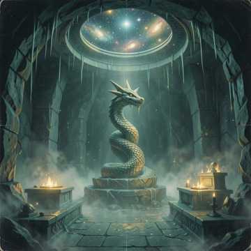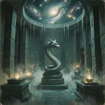 Dark progressive trance, claustrophobic ancient chamber atmosphere, deep rattling tribal drums, ominous bass, emotional male vocals, mystical female vocals, female spoken word, hissing flutes, 127 bpm, underground temple, serpent deity, tense and hypnotic