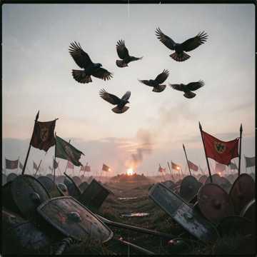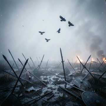 Dark progressive trance, epic Nordic atmosphere, haunting male vocals, ethereal female vocals, female spoken word, deep tribal drums, distant war horns, melancholic flutes, 128 bpm, ancient battlefield, fate, ravens, solemn