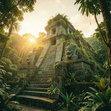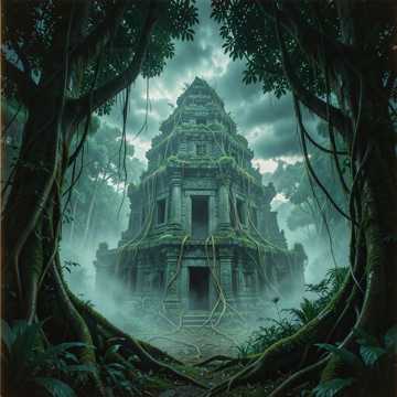 Dark progressive trance, ancient jungle atmosphere, dense ambient insects, deep tribal drums, emotional male vocals, mystical female vocals, female spoken word, distant jungle flutes, 124 bpm, overgrown temples, humid mystery, ominous yet driving