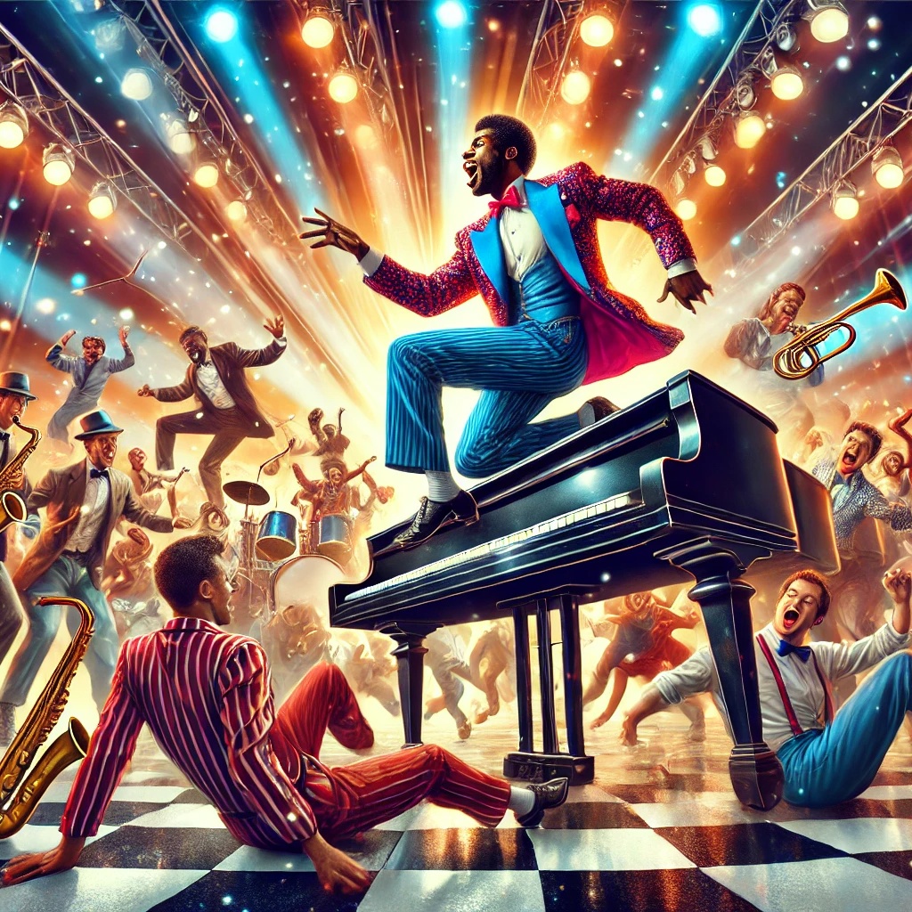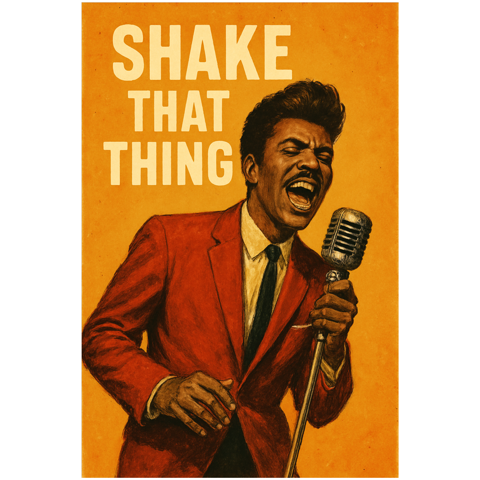 1950s rock ‘n’ roll song in the energetic style, Up-tempo 12-bar blues progression with pounding boogie-woogie piano, driving upright bass, electric guitar with bluesy riffs, and lively drums with snare accents and ride cymbal, Include tenor saxophone fills for classic rock ‘n’ roll flavour, Male vocals with raw, powerful delivery, raspy edge, and enthusiastic exclamations like ‘woo!’, ‘whoo-whee!’, ‘oh my soul!’, The mood is wild, danceable, joyful, and commanding, encouraging everyone to dance and shake all night