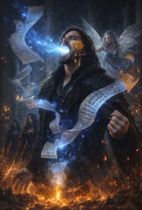 A dramatic metal opera duet featuring a powerful female lead voice and a deep male baritone, The arrangement blends symphonic gothic and fantasy epic elements: cinematic drums, layered choirs, cello, strings, and orchestral builds, The woman tells a poetic story honoring a mystic man, while the male voice echoes, grounds, and supports without dominating, The chorus is sung together in an ancient language (e, g, Greek), creating a sacred ritual atmosphere, No romantic tone — the focus is on reverence, strength, and mythic presence, Massive production with whispers, crescendos, and a spiritual, cinematic climax