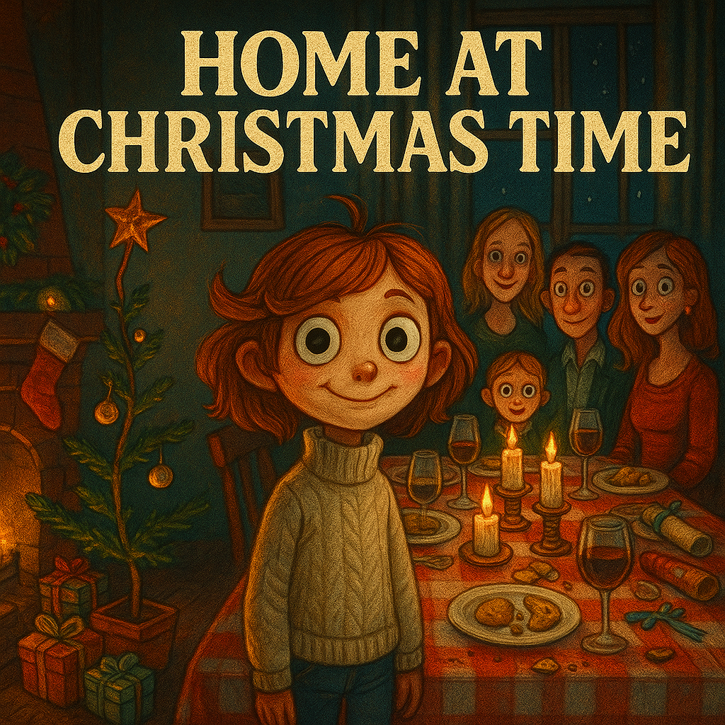 Create a classic, nostalgic Christmas ballad in the style of vintage holiday records from the golden age of big band jazz, Male solo vocalist with a smooth, warm tone, Backed by traditional acoustic instruments: brushed jazz drums, upright bass, grand piano, soft strings, and muted brass (like flugelhorns or trombones), Melody should be emotional and elegant, with slow swing rhythm and crooner-style phrasing, The atmosphere is cozy, intimate, and magical — evoking candlelight, family gatherings, small decorated Christmas trees, and warm kitchens filled with holiday food, Emphasize melody-driven composition with vintage charm and timeless orchestration, No modern elements, no synths, no pop hooks, Just the kind of track you’d expect to hear on an old phonograph beside a fireplace, with snow possibly falling outside — but the focus is warmth, love, and gentle holiday nostalgia shared over good food and laughter