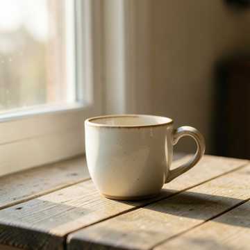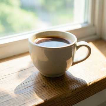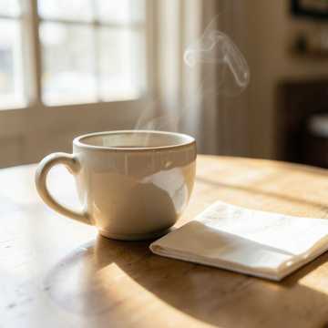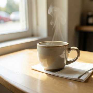 Mood: Cozy cafe atmosphere, warm sunlight through windows, calm romantic feeling, peaceful and intimate, soft and comforting vibe
