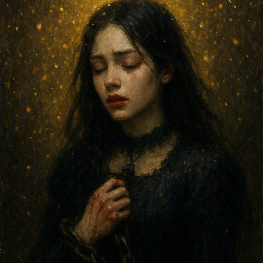 Amazing Studio Quality, Crystal Clear Sound, This masterpiece synth-metal fusion opens with atmospheric ASMR whispers and gothic choir, quickly launching into ferocious thrash metal riffs, pounding double kicks, and lush baroque strings, Sultry, powerful female vocals—laden with sensual moans—alternate between decadent cinematic passages and explosive distorted chorus hooks, Intricate guitar solos interweave with industrial textures and orchestral drama, maintaining a romantic yet ominous gothic tone, The arrangement pulses with sexy, tragic energy, cleanly mixed to highlight both heavy brutality and delicate, decadent moments